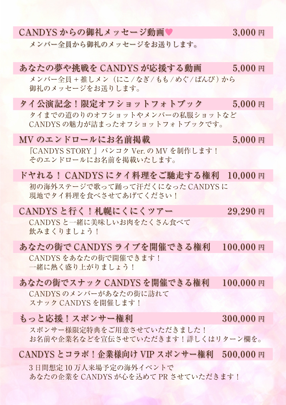 使用用途:タイへの渡航費/出演費/楽曲衣装製作費/各映像製作費など