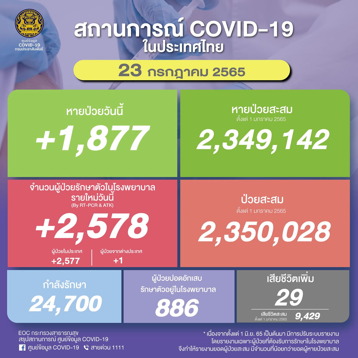 タイ保健省は2022年7月23日(土)、1日で確認された新型コロナウイルス陽性者が2,578人(海外から到着が1人)で、29人が死亡したと発表しました。また、回復したのは1,877人です。