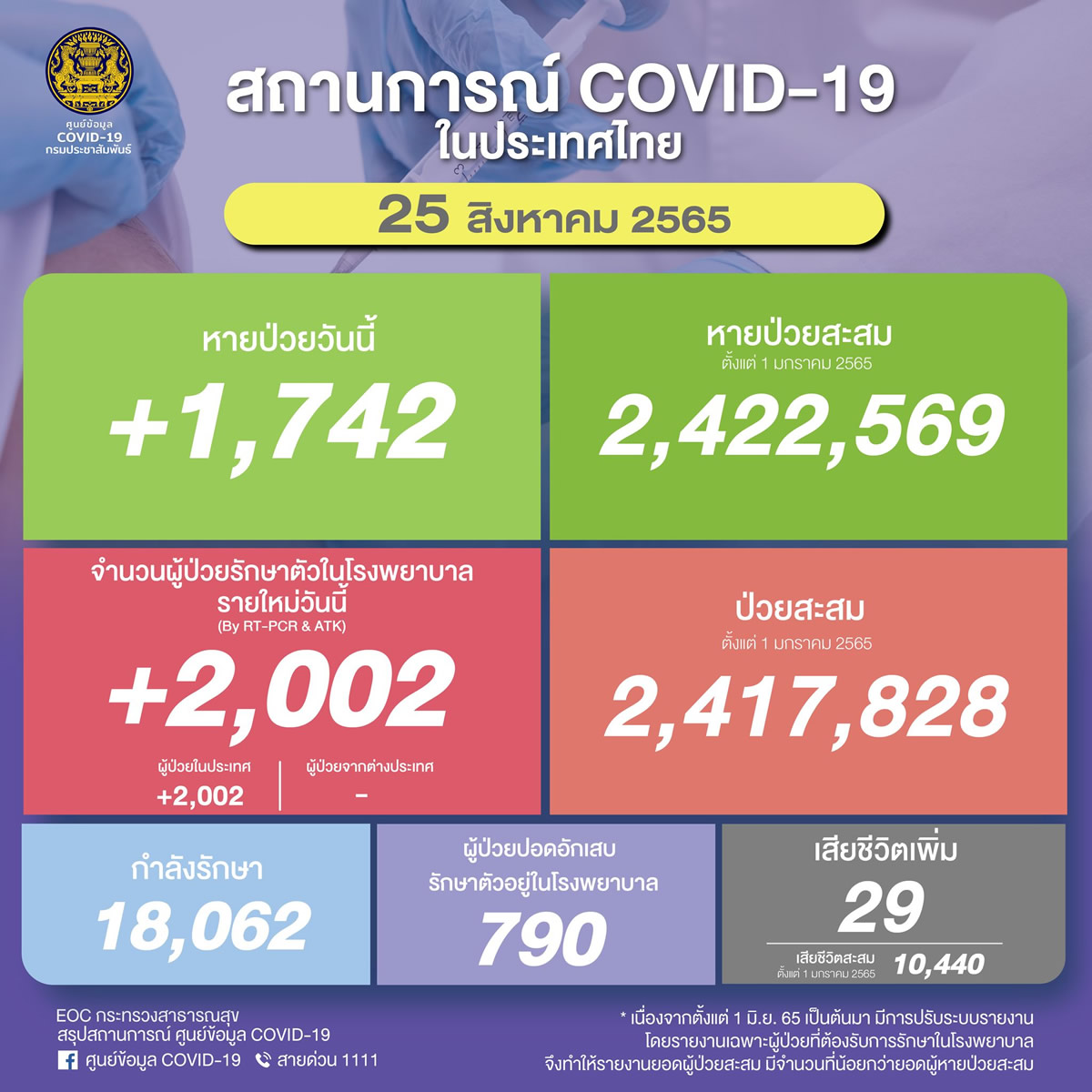 タイ保健省は2022年8月25日(水)、1日で確認された新型コロナウイルス陽性者が2,002人(海外から到着が0人)で、29人が死亡したと発表しました。また、回復したのは1,742人です。