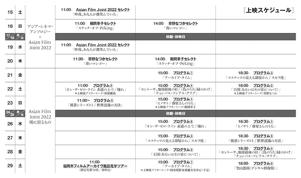 ▶︎10/21〜29はメインとなる特集上映『Asian Film Joint 2022|場に宿るもの』を実施。7本の日本初上映+2本の九州初上映を含む計8プログラム・14本のアジア映画を紹介。