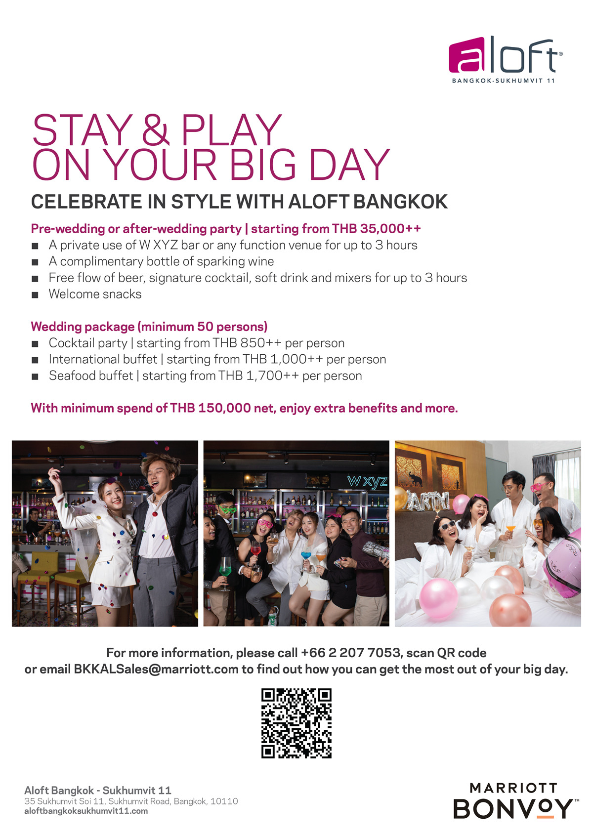 都会の中心で、素晴らしい景色とエレガントな会場で結婚式を挙げるための、ユニークなセレブレーション・パッケージの問い合わせは、、メール:BKKALSales@marriott.com 電話:02 207 7053 または www.marriott.com/en-us/hotels/bkkal-aloft-bangkok-sukhumvit-11/events をご覧ください。