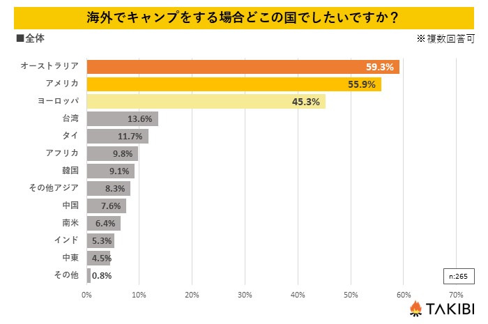 質問1で「はい」と回答した方へ「海外でキャンプをする場合どこの国でしたいですか?」と尋ねたところ、1位:オーストラリア(59.3%)、2位:アメリカ(55.9%)、3位:ヨーロッパ(45.3%)という結果になりました。
