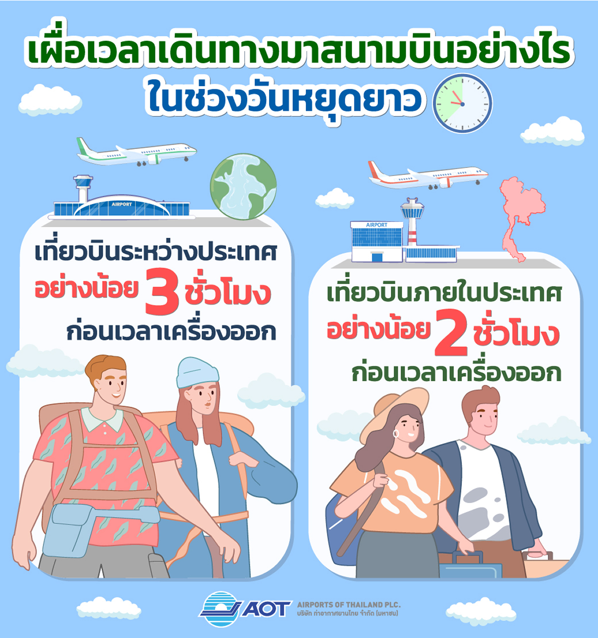 タイ空港公社はスワンナプーム空港とドンムアン空港の利用者に対し、国内線の場合は出発の2時間前までに、国際線の場合は出発の3時間前までに空港に到着するように呼び掛けています。
