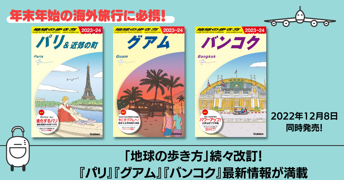 株式会社 学研ホールディングスのグループ会社、株式会社 地球の歩き方は、『地球の歩き方 D18 バンコク 2023~24』『地球の歩き方 A07 パリ&近郊の町 2023~24』『地球の歩き方 C04 グアム 2023~24』の3タイトルを、2022年12月8日に全国の書店及びオンライン書店で発売します。