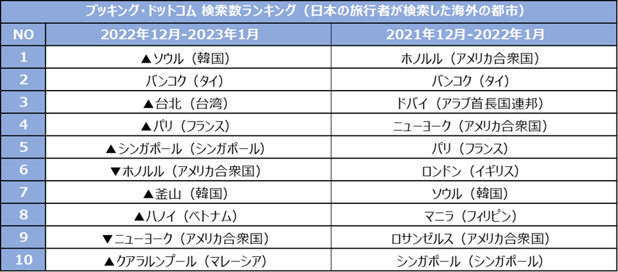 一方で、不動の人気を誇るホノルルやニューヨーク、ロサンゼルスといったアメリカ合衆国の都市のランクがすべて下がっていることもわかりました。今年ランクインした欧米の都市であるパリ(フランス)、ホノルル(アメリカ)、ニューヨーク(アメリカ)をランクインしたアジア圏の国と比較すると、アジア圏の国の順位の上昇率が高く、同位となったバンコク(タイ)を除いたトップ10のアジア圏の各国は160以上ランクを上げています。また、今年のランキングでは10都市のうち7つがアジア圏の国であったことから、日本から近く、渡航規制が緩和されている国の人気が高まっていることが伺えます。