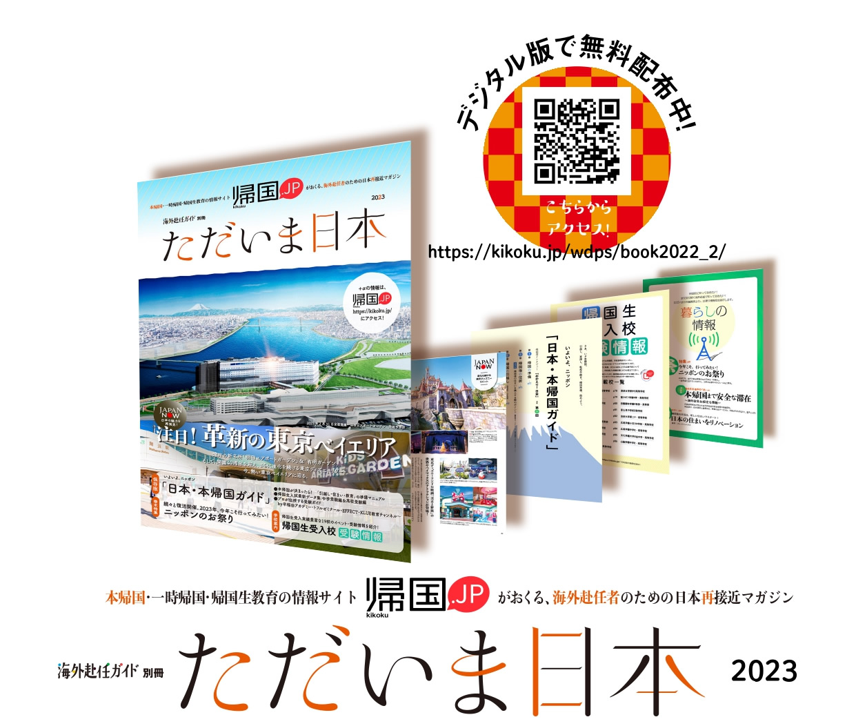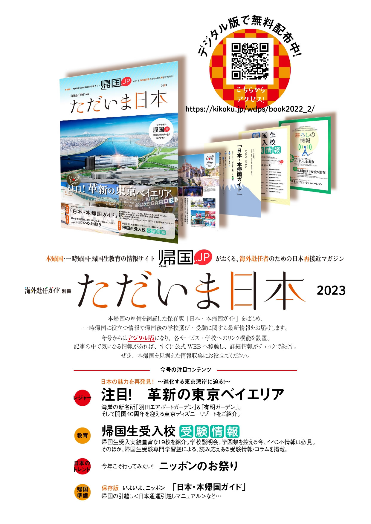 「帰国.JP/ただいま日本」では、日本帰国の準備を網羅した保存版「日本・本帰国ガイド 」 をはじめ、一時帰国に役立つ情報や帰国後の学校選び、受験に関する最新情報を提供しています。