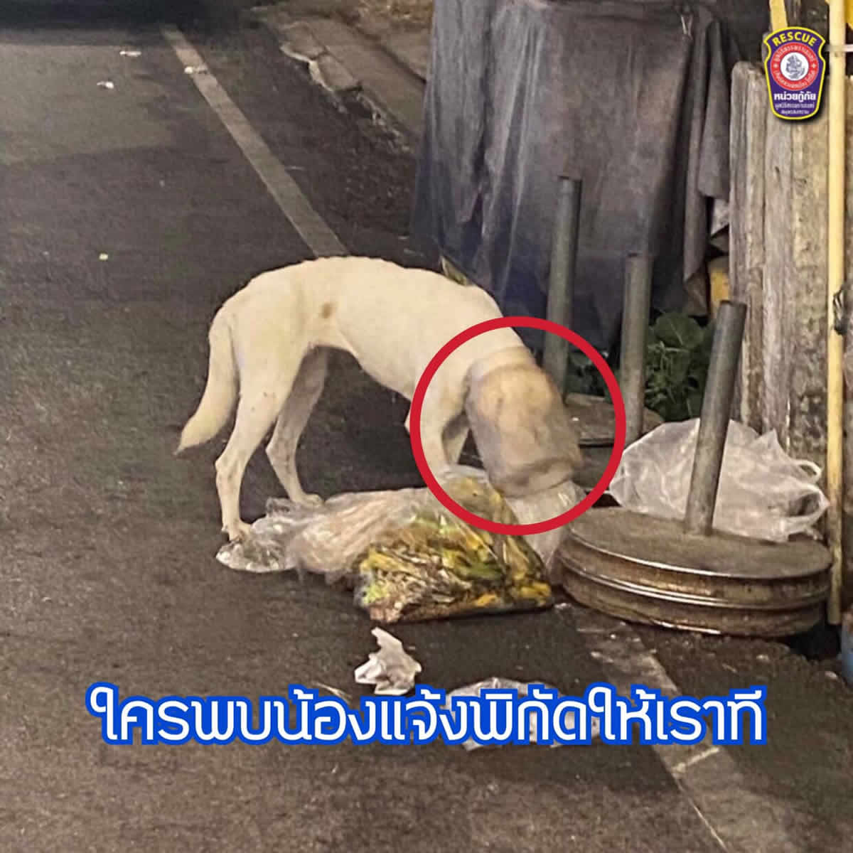 サパラーチェーン救助隊は2023年2月9日、サムットソンクラーム県にあるアンパワー水上マーケットのエリアで、頭にプラスチックのボトル被ったメスの犬を保護しました。