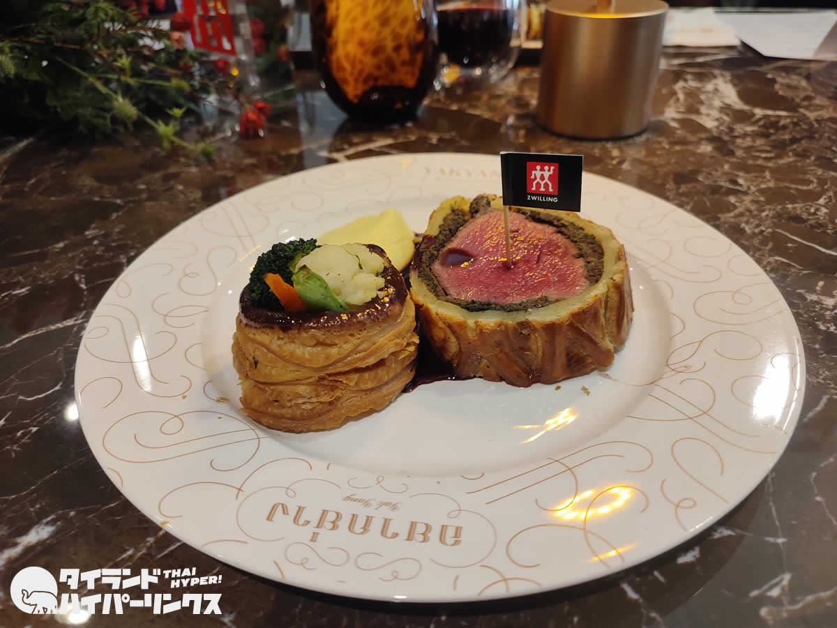 メインは伝統的なビーフ・ウェリントン。牛肉をパテで覆い、その上からパイ生地で包んで焼いたイギリスの伝統料理です。