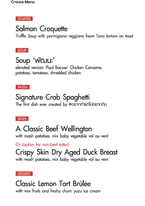 フランスの3つ星シェフであるポール・ボキューズ氏のスタイルのパイで蓋されたチキンコンソメのスープ。Bigシェフの父が20年以上に渡って毎週日曜日に作ってくれたスープを発展させ、Bigシェフの名字にちなんでพัฒนะ(ワッタナ)と名付けられました。