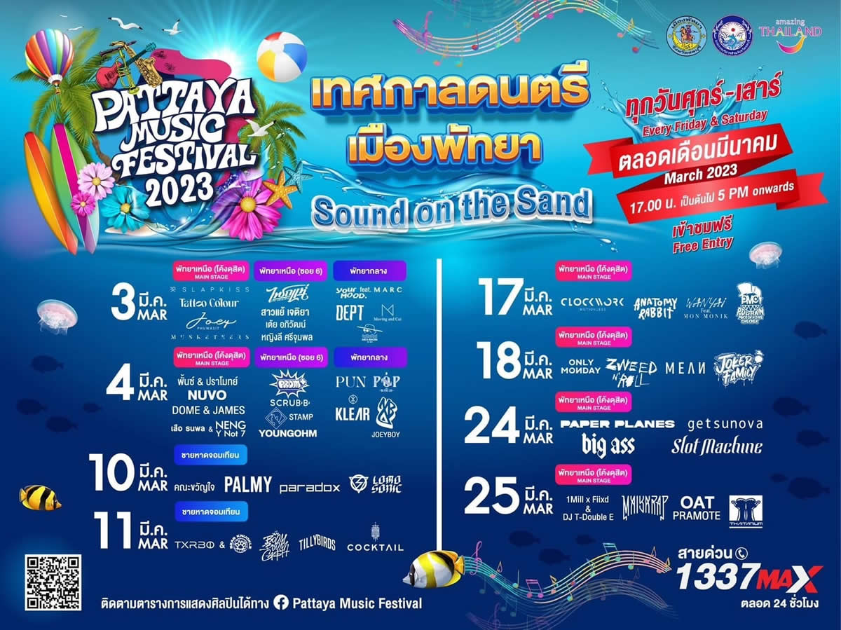 タイ東部チョンブリ県パタヤ市が主催する音楽フェス「PATTAYA MUSIC FESTIVAL 2023(パタヤ音楽祭2023)」が、2023年3月の毎週金曜日と土曜日にパタヤの各地で開催されます。入場無料。