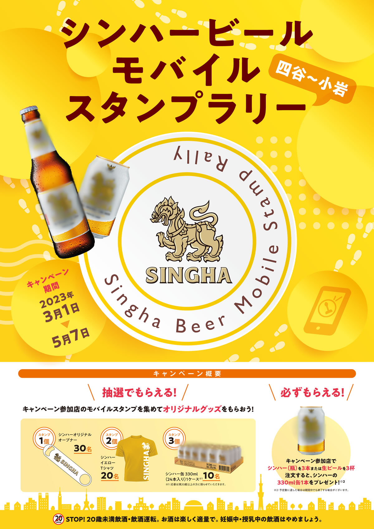 アイコン・ユーロパブ株式会社は、シンハービールのおいしさを、より多くの方々に知ってもらいたいとして、2022年秋に引き続き、総武沿線(四谷⇔小岩)のタイレストラン28店舗を対象としたモバイルスタンプラリーを実施。対象店舗を訪問して2次元コード(QRコード)を読み込んでスタンプを獲得すると、シンハーオリジナルオープナーやシンハービール缶(330ml)1ケース(24本入り)など素敵な景品を抽選でゲットできます。