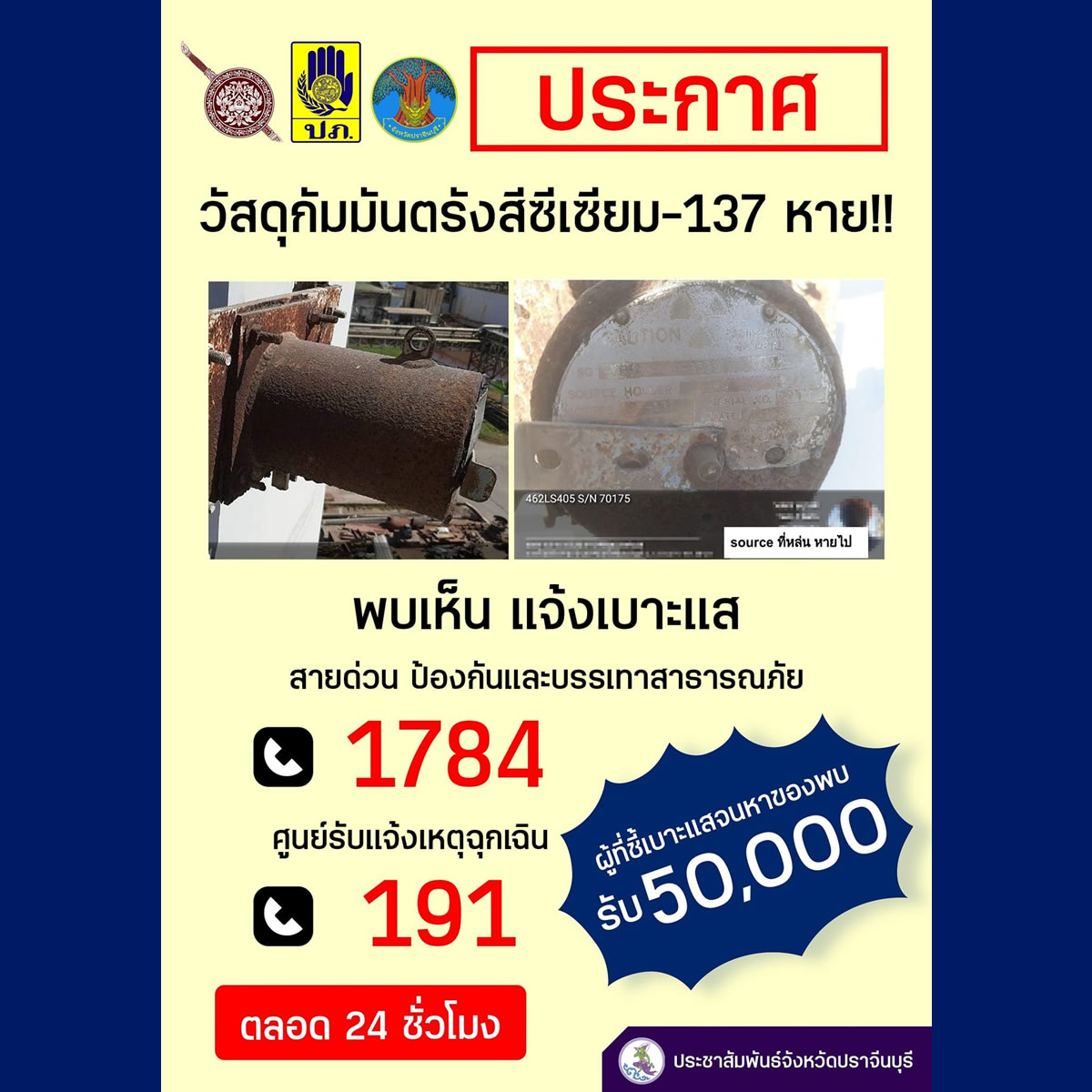 プラチンブリ県知事は、火力発電所から半径2キロ以内を捜索しましたが、発見されていないと述べ、金属製容器の蓋を開けると被爆する可能性があると警告しています。
