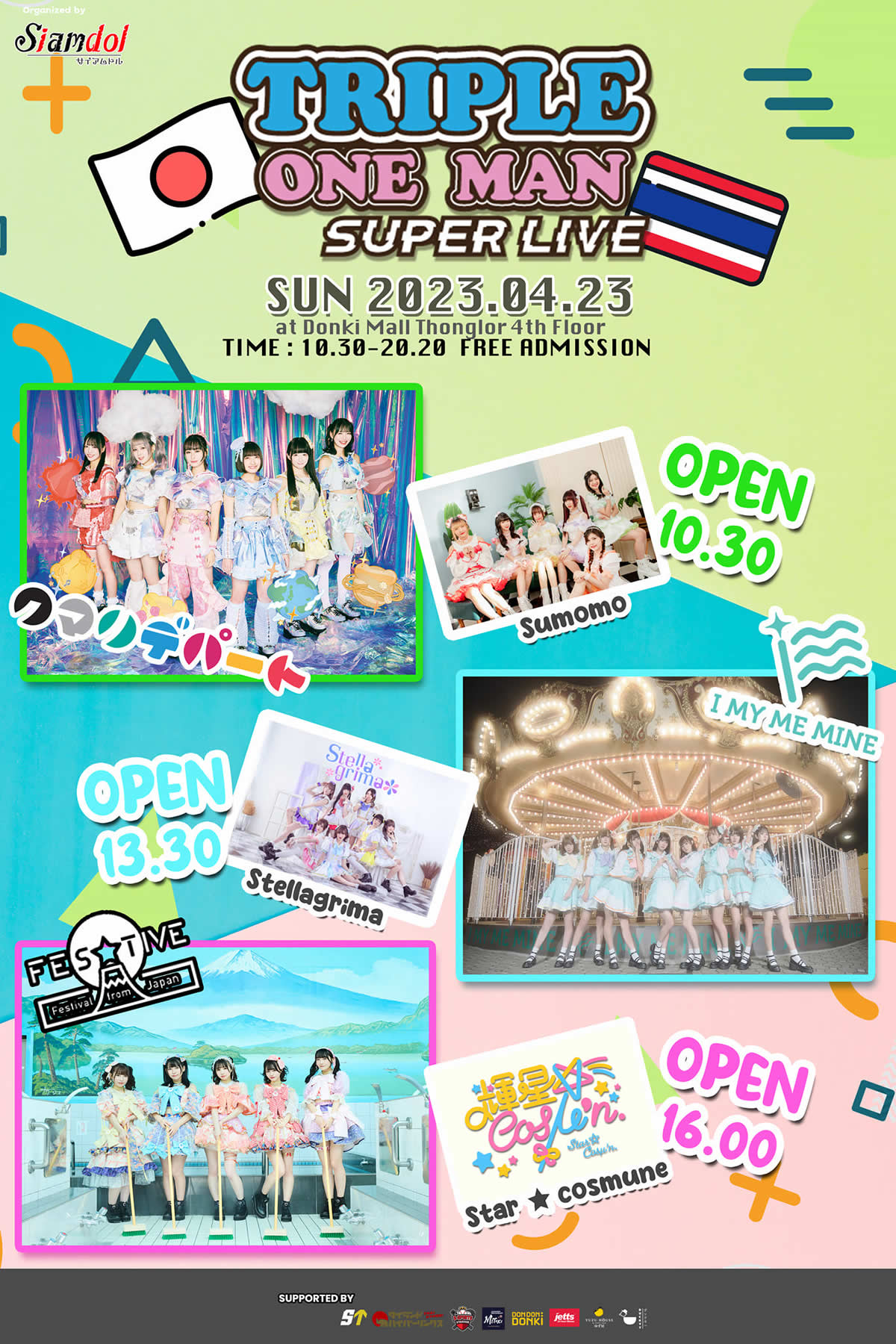 日本のアイドル3組(FES☆TIVE、クマリデパート、I MY ME MINE)が2023年4月23日(日)、バンコクのドンキモール・トンロー4階で、トリプルワンマンライブ「TRIPLE One-man Super Live」を開催します。主催はSiamdol。入場無料。