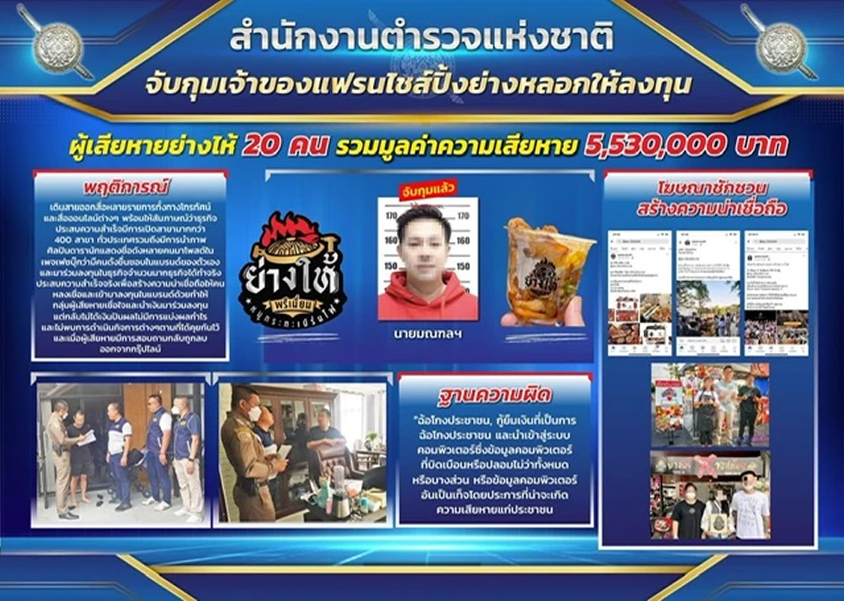 タイ警察は2023年4月19日、20人以上を騙して総額553万バーツを奪ったとして、フランチャイズレストラン「ヤーンハイ(ย่างให้)」のオーナーであるモントン・トーンカム(มณฑล ทองคำ)容疑者を逮捕したと明らかにしました。