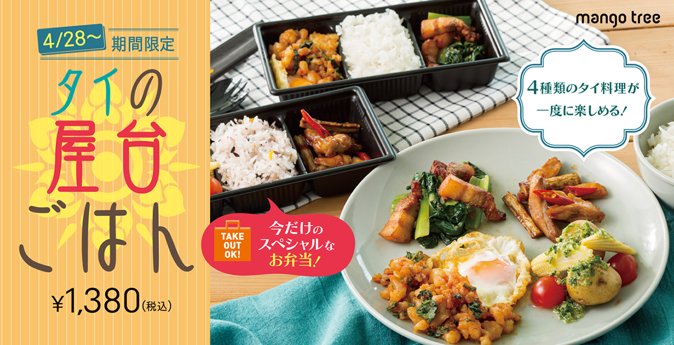 タイ・バンコクに本店をもつ「マンゴツリー」の姉妹店で本格タイ料理をファストフードのようにカジュアルに楽しめるイートイン&テイクアウト「マンゴツリーキッチン」で、2023年4月28日(金)から、4種のタイ料理を一度に楽しめる「タイの屋台ごはん」をイートイン、テイクアウトで販売します。