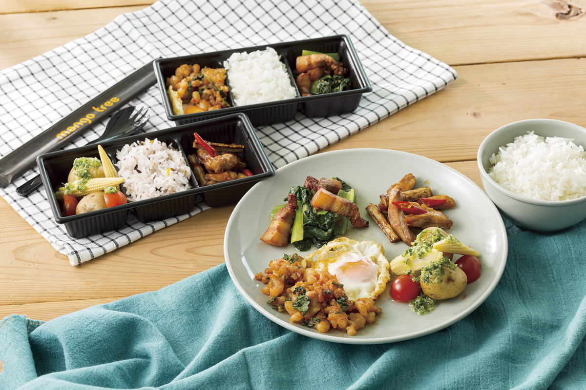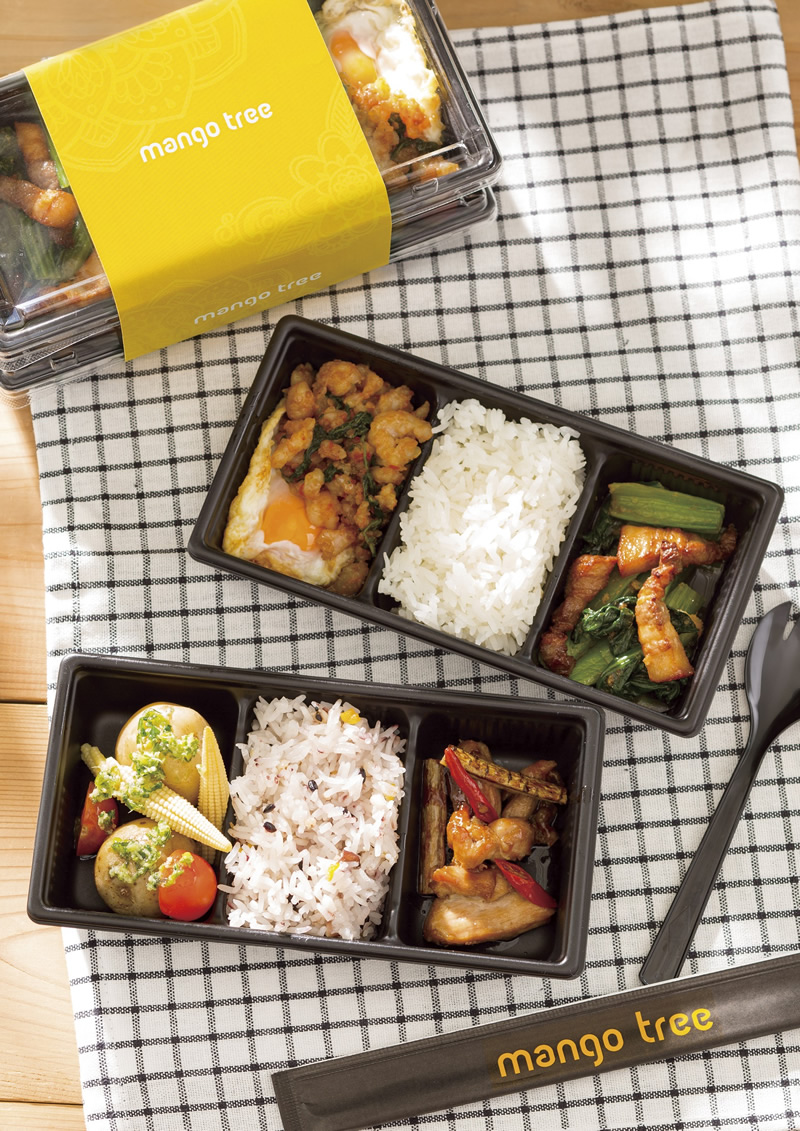 イートインでは、少しずついろいろな種類のおかずをごはんと一緒に食べるタイのストリートフードのような感覚で、テイクアウトでは、タイの段々重ねの手提げお弁当箱“ピントー”をヒントに2段重ねのお弁当に仕上げました。ゴールデンウィークのおでかけなどにもぴったりです。