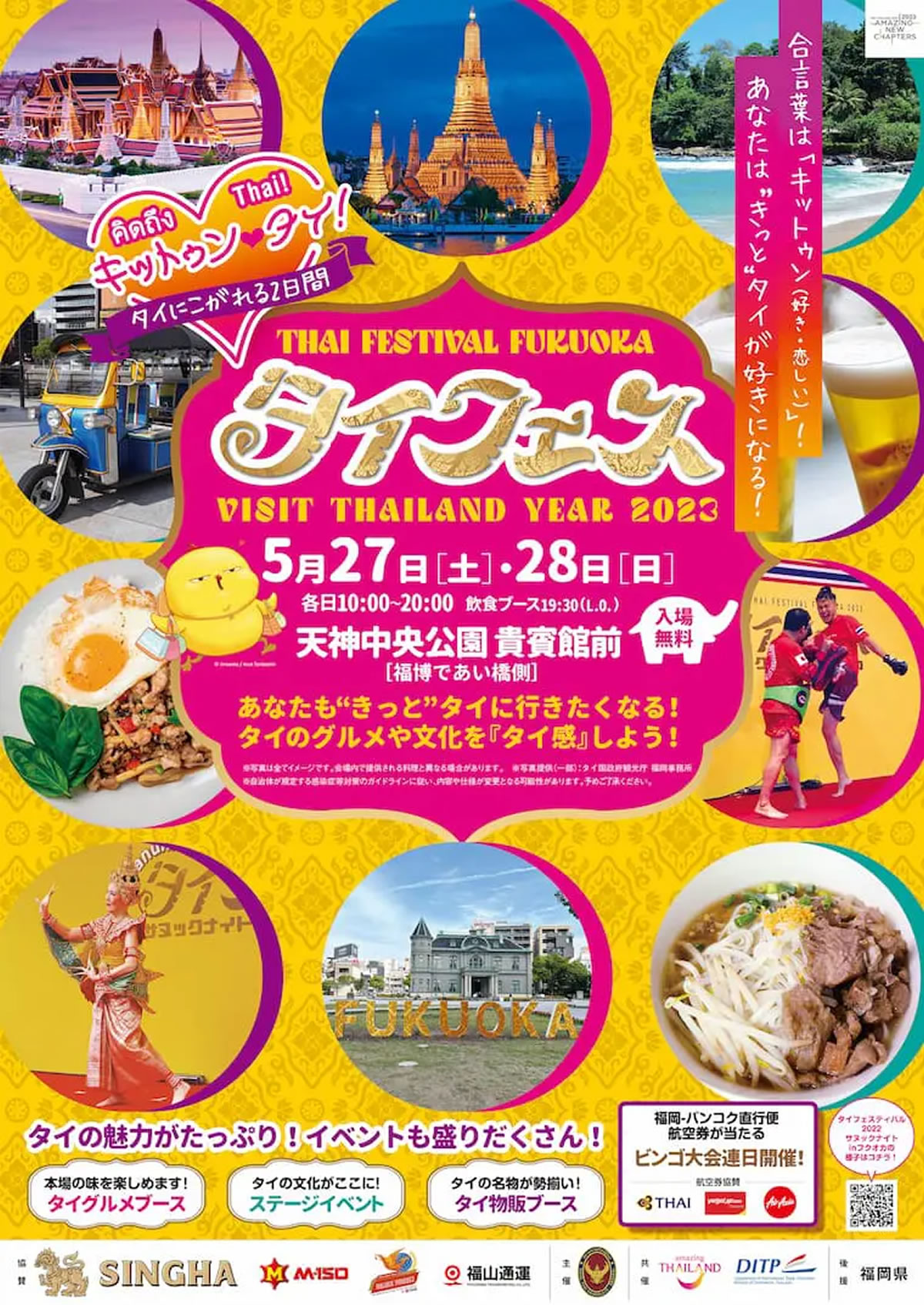 「タイフェスティバル福岡&VISIT THAILAND YEAR 2023」が、2023年5月27日(土)・28日(日)の2日間に渡って、 福岡県福岡市の天神中央公園貴賓館前で開催されます。入場無料。