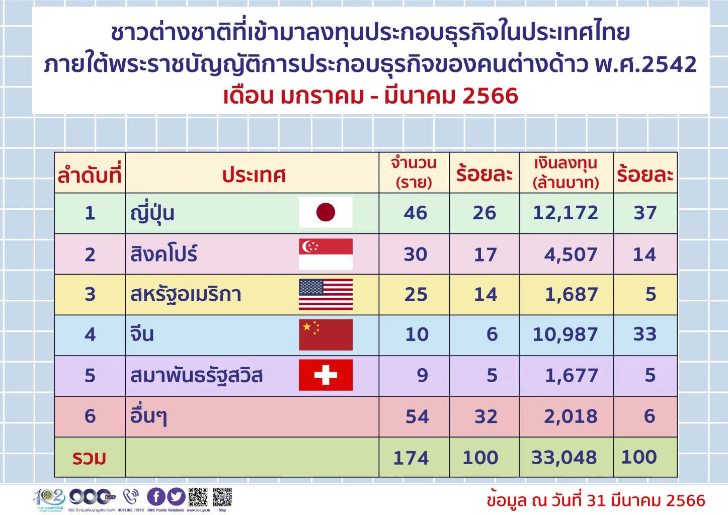タイ商務省ビジネス開発局のデータによると、タイは第1四半期に外国人投資家から330億4800万バーツの投資を受け、1932人のタイ人の雇用を創出するとともに、タイ人への知識移転も行いました。