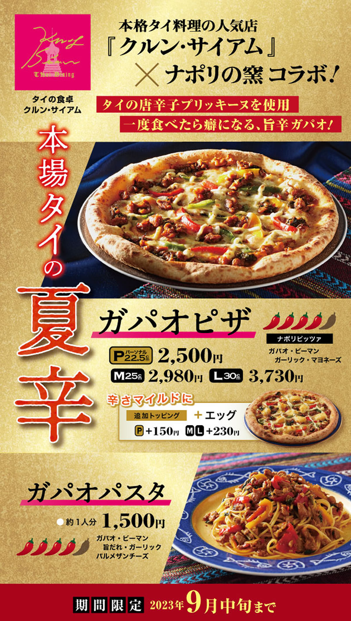 ナポリの窯は国内145店舗とタイに3店舗展開をしており、タイ進出5周年記念として、株式会社SUU・SUU・CHAIYOOが運営する「クルン・サイアム」のガパオを使用した、「ガパオピザ」「ガパオパスタ」を発売する運びとなりました