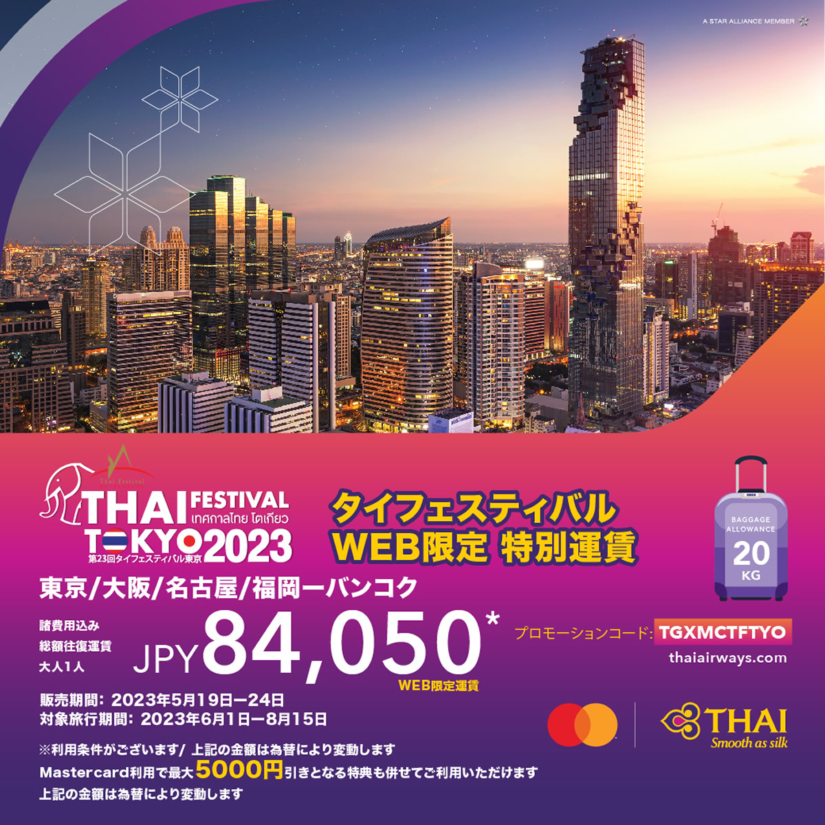 「第23回 タイフェスティバル東京 2023」の開催に合わせてタイ国際航空は、「タイフェス東京 2023 開催記念特別セール!」を2023年5月19日~24日に開催。日本とタイとの往復運賃が、84,050円~で提供です。プロモーションコードは「TGXMCTFTYO」。対象旅行期間は2023年6月1日~8月15日のため、この夏休みのタイ旅行にはピッタリです!