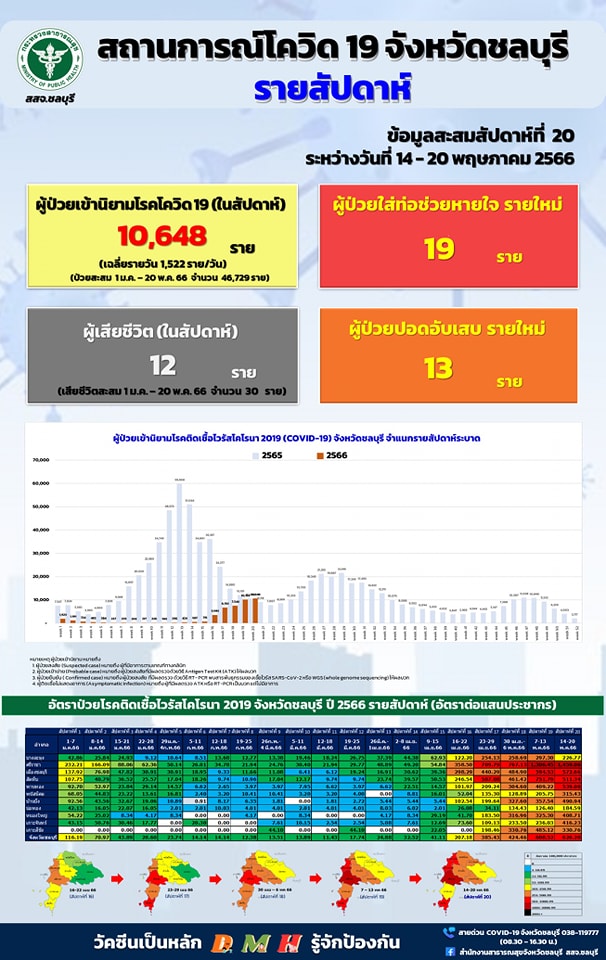 ビーチリゾートのパタヤや日系企業が多く進出するシラチャを有するチョンブリ県は2023年5月22日、5月14日~20日の1週間で新たに10,648人の新型コロナウイルス陽性を確認し、12人が死亡したことを明らかにしました。13人が肺炎の治療を受けており、19人が酸素吸入を必要としています。