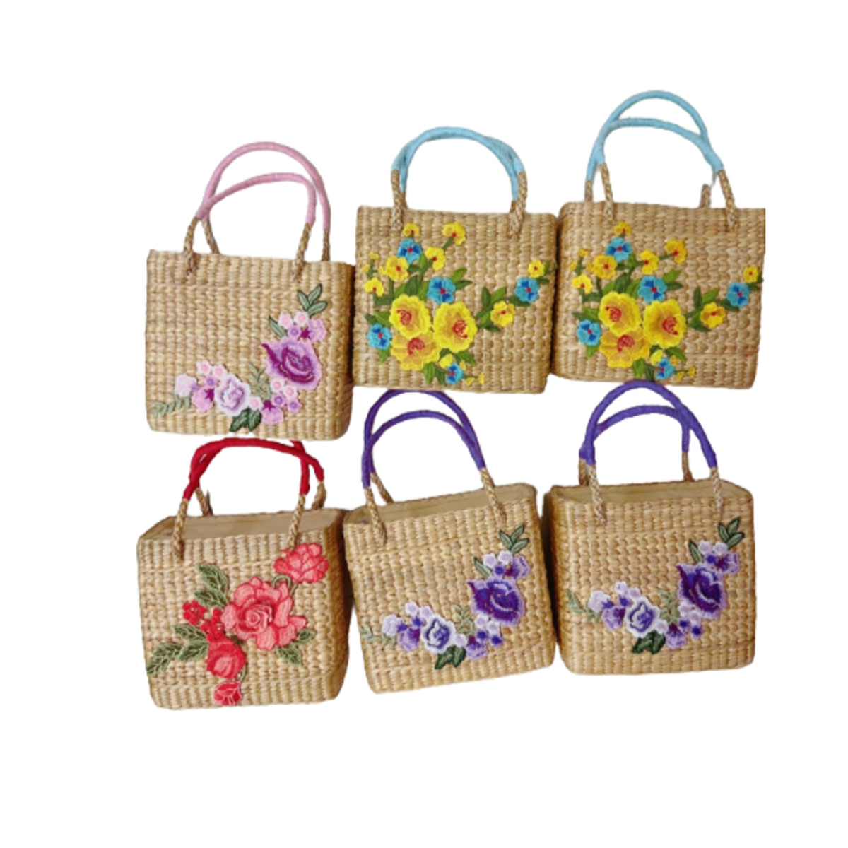 1点1点手編みしたかごに、華やかな刺繍をあしらっています。
