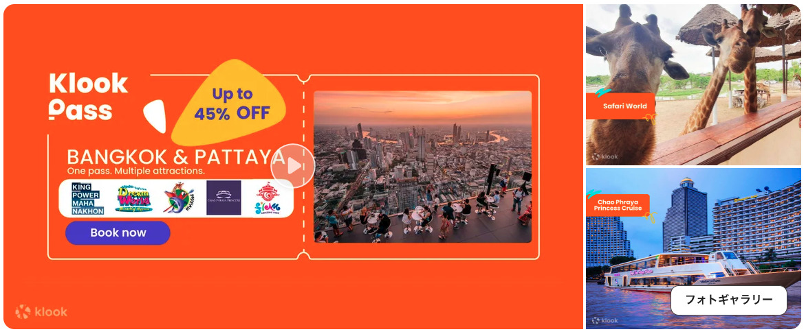 Klook独自のデジタル観光周遊パス「Klookパス」のバンコク・パタヤ版、これ1枚で、マハナコンスカイウォークやサファリワールド、サンクチュアリーオブ トゥルース、チャオプラヤー川 プリンセス号クルーズなど、人気観光スポットやツアーからお好きなアクティビティを2つ〜4つ選んで予約できます。最大45%OFFとなり、個別に予約するより断然お得です。