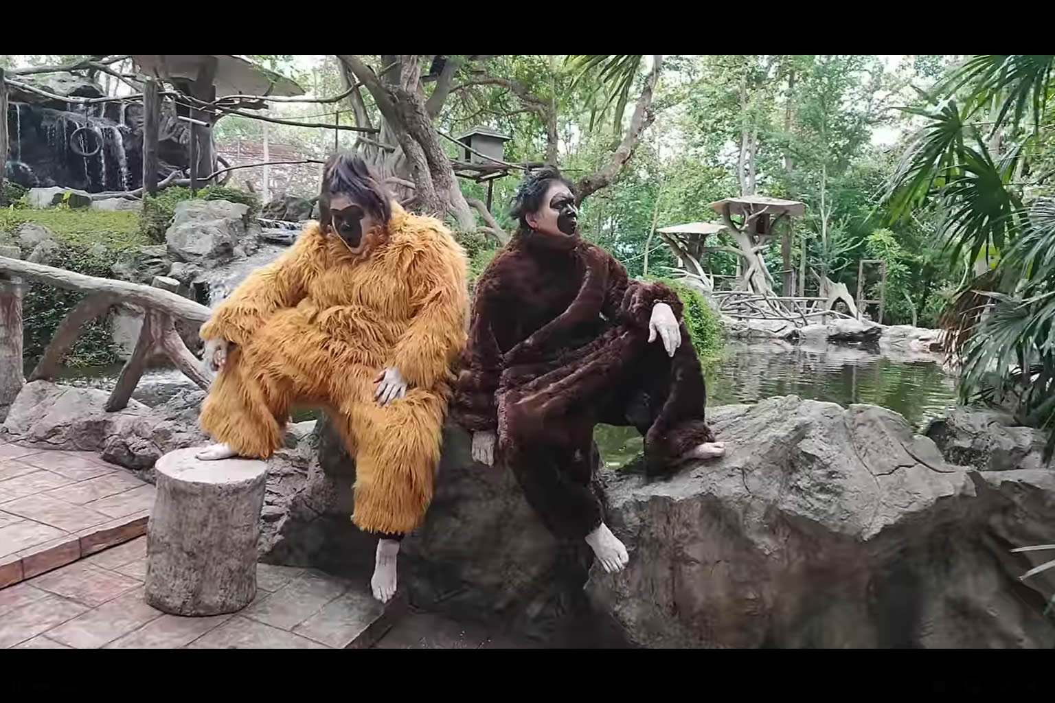 テナガザルの捕獲訓練ですが、本物のテナガザルが訓練に参加できるわけもなく、テナガザル役をすることになったのがスタッフの女性2人でした。