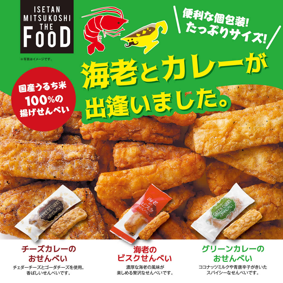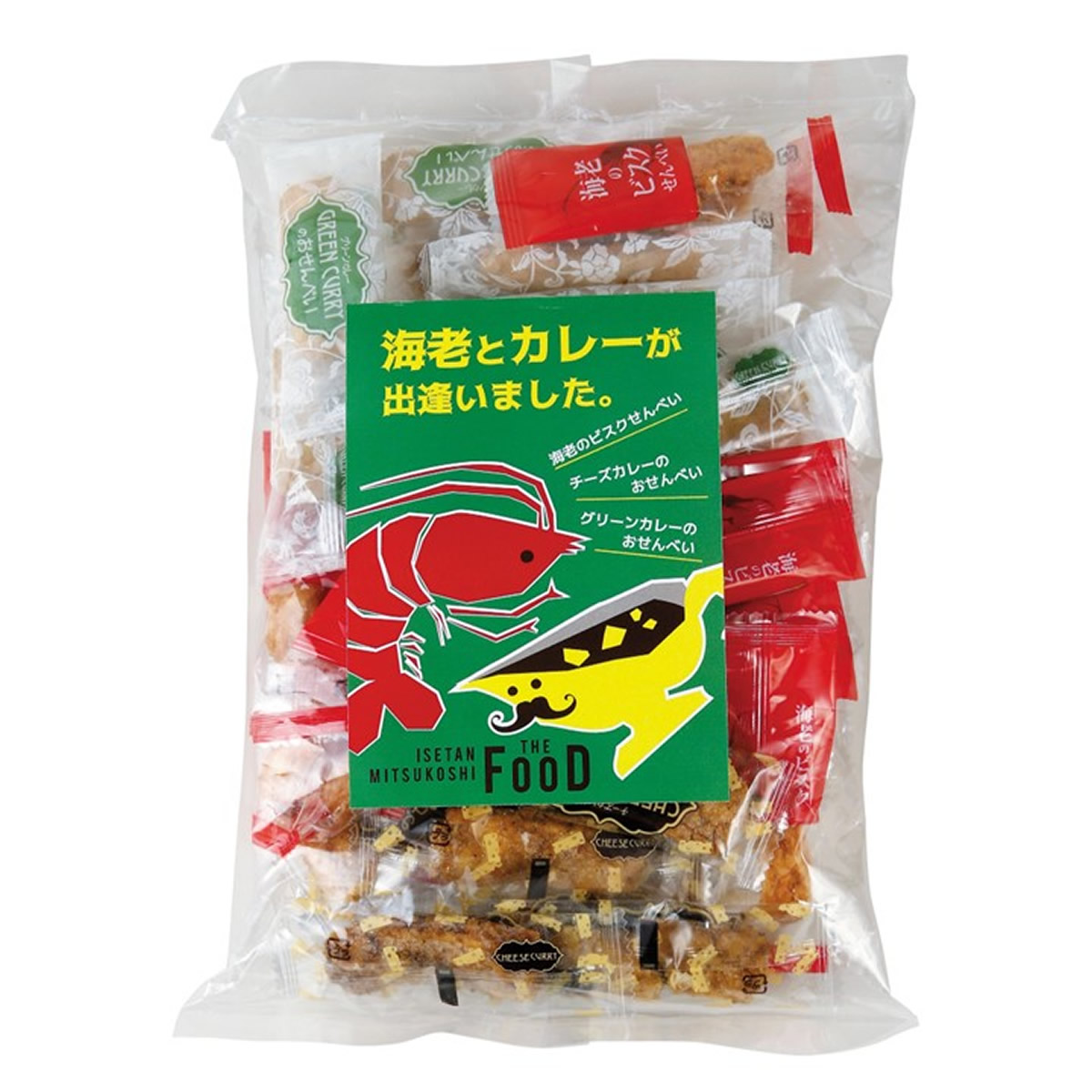 「海老とカレーが出逢いました。」はグリーンカレー、チーズカレー、えびのビスクの3種類が入った国内産うるち米100%使用の揚げせんべいです。