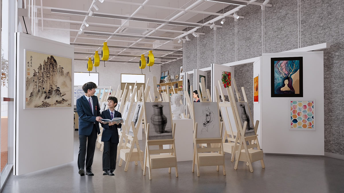 ● 最新のテクノロジーと創造的な機器を備えたアートスタジオは、学生がさまざまなテクニックを学び、試すための幅広いメディアへのアクセスを提供しています。また、アート専用のイーゼルスタジオも併設され、展示品の展示に利用されます。