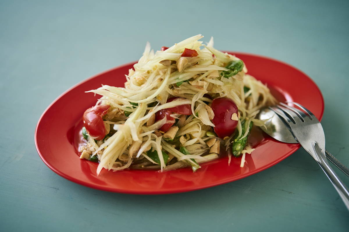 最近日本でもよく見かける青パパイヤで作るサラダ「タムタイ」。