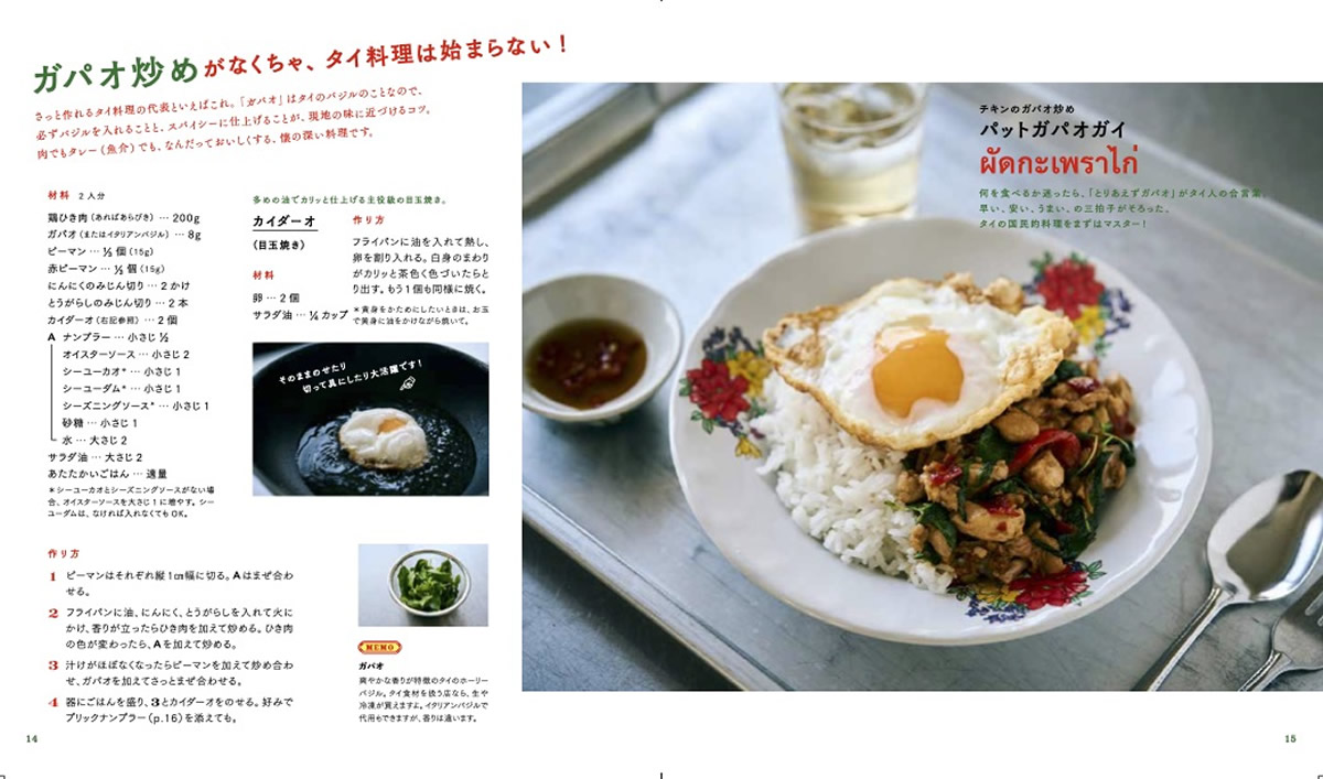 なんとも複雑そうな味つけに思えるタイ料理ですが、作ってみると、実は意外と簡単です。日本と違い、だしをとったりアクをとったりすることもなく、焼いて炒めて混ぜ合わせて……と、シンプルなのが持ち味。特にガパオ炒め、パッタイ、カオマンガイなど、タイ語で「アハーンジャーンディアオ」と呼ばれる一皿料理には、工程がシンプルで時間をかけずに作れるものも多いので、チャレンジしやすいのが特徴です。日本でもよく知られる定番だけでなく、今バンコクで人気の料理やイサーンなどの地方料理までを全網羅しています。