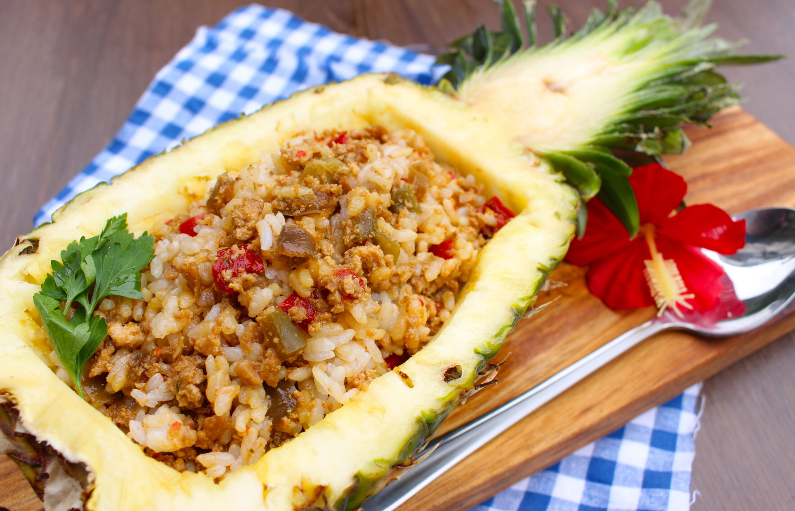 パイナップルをそのまま器にした、 スパイシーなエスニックガパオライス。