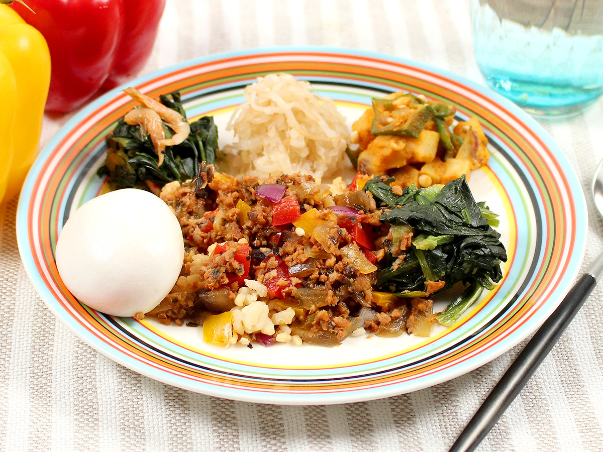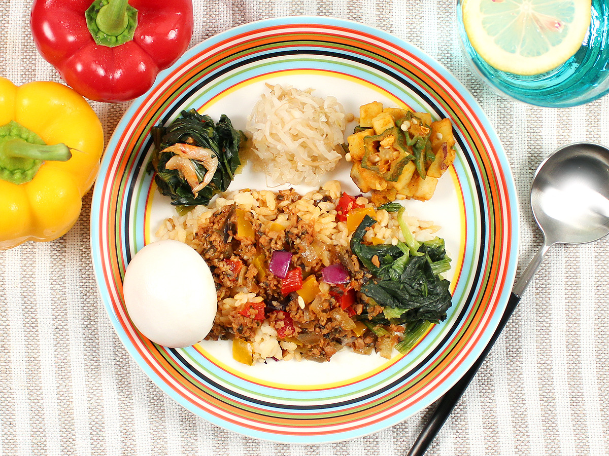 バジルとナンプラーを使用しスパイシーに仕上げたタイの定番料理ガパオライスです。旨味たっぷりのチキンスープで炊いたマンナンライスにほうれん草と、二色のパプリカと赤たまねぎを混ぜた鶏ミンチをのせました。半熟卵をトッピングしておりますので、よく混ぜてお召し上がりください。