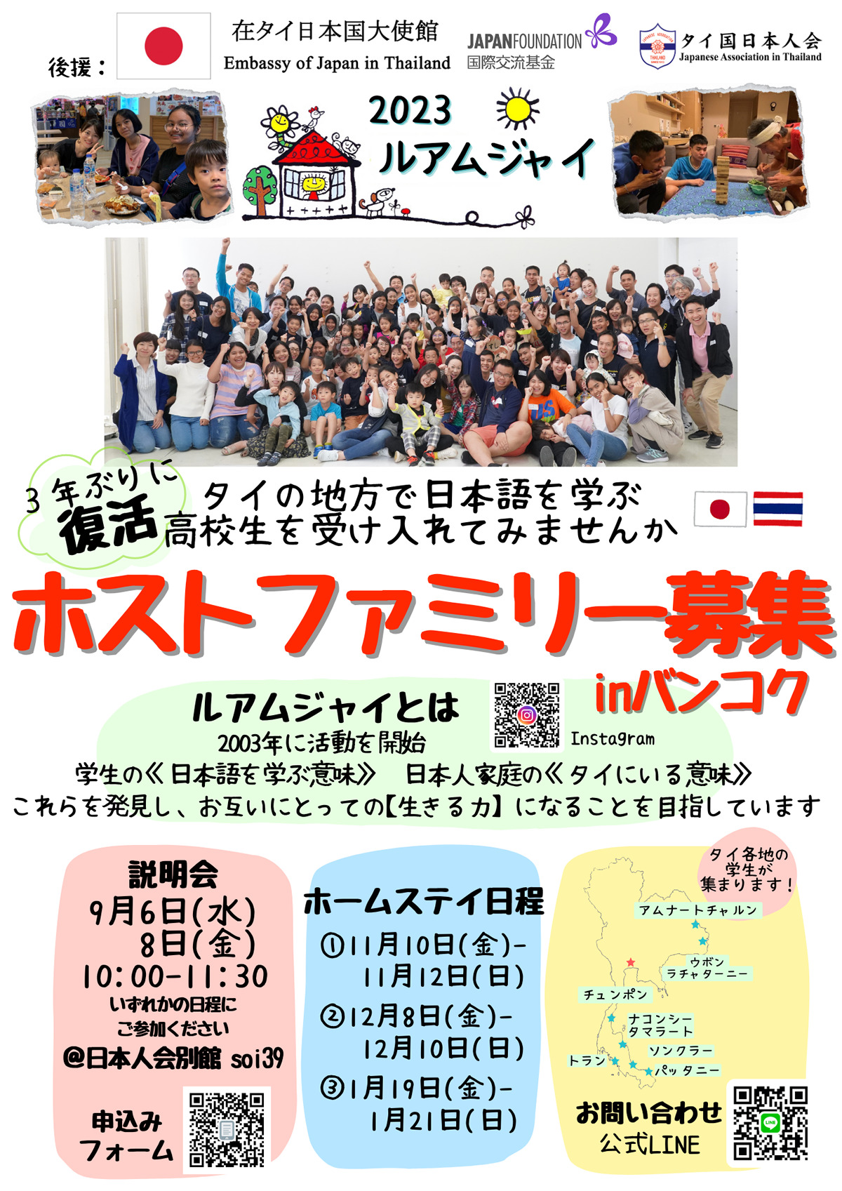 2003 年から始まったホームステイプログラム「ルアムジャイ(心をひとつに)」は日本語を学ぶタイの学生と受け入れる家庭がそれぞれに、日本語を学ぶ意味やタイにいる意味を発見し、お互いにとっての“生きる力(エンパワーメント)”になることを目指しています。