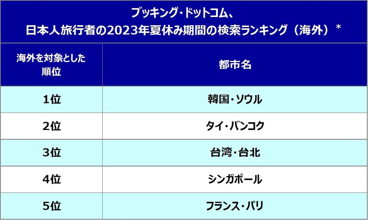 世界最大級の宿泊予約サイト Booking.com は、2023年の夏休み期間(7月1日(土)~8月31日(木))を対象とした、日本人旅行者によるブッキング・ドットコム上での宿泊検索状況を調査。その結果、日本人旅行者が検索した海外の宿泊先の1位は韓国・ソウル、2位バンコク、3位台北、4位シンガポール、5位パリでした。