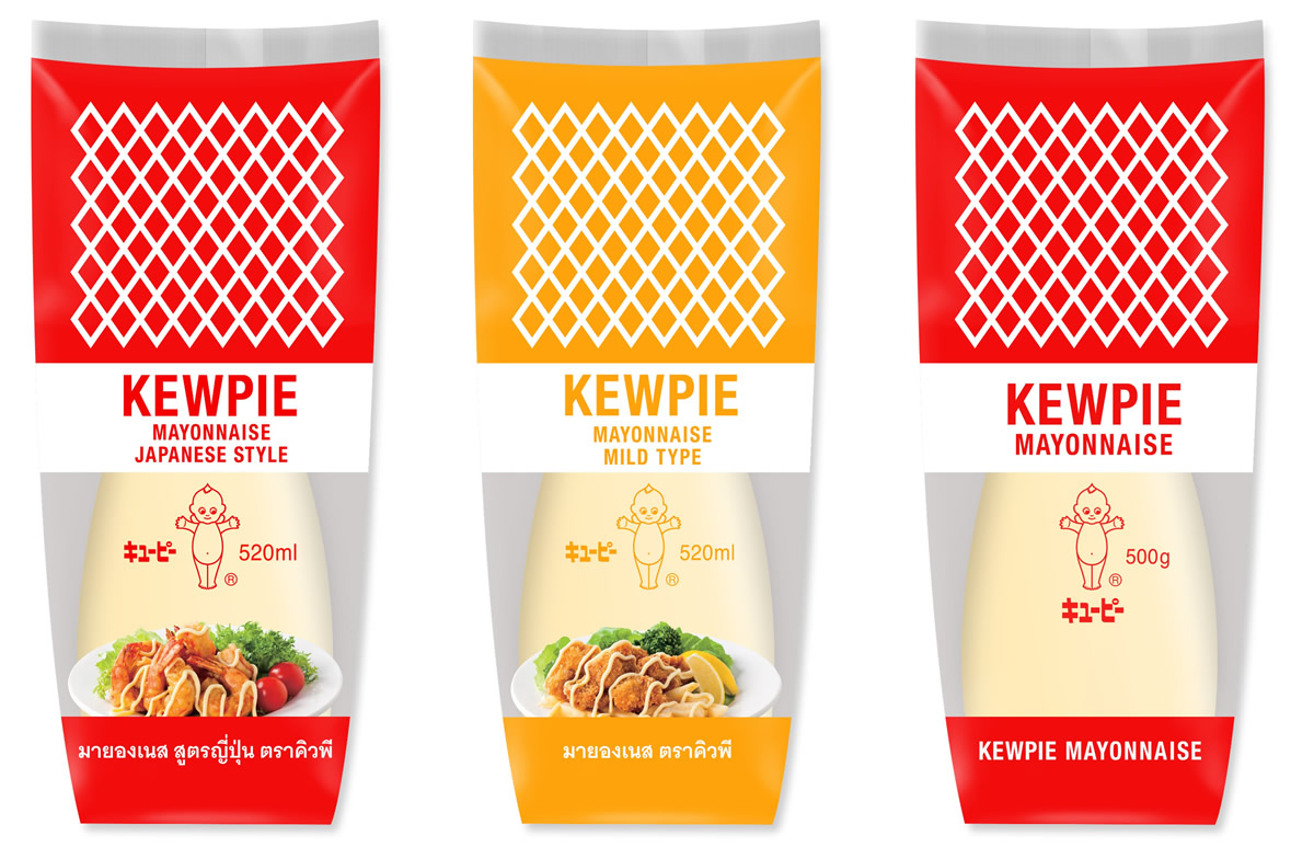 【生産品目例】(左から)キユーピー マヨネーズ ジャパニーズスタイル(タイ国内家庭用)、キユーピー マヨネーズ マイルドタイプ(タイ国内家庭用)、キユーピー マヨネーズ(輸出商品一例、オーストラリア家庭用)