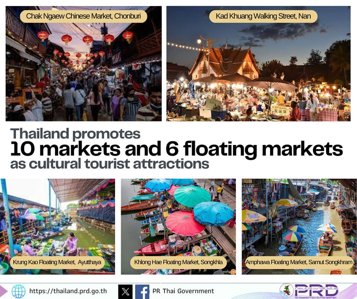 タイ文化省は、観光地として開発されている10の市場と6つの水上市場を、美しい文化的観光地として推進しています。タイ政府広報局が2023年10月5日に伝えています。
