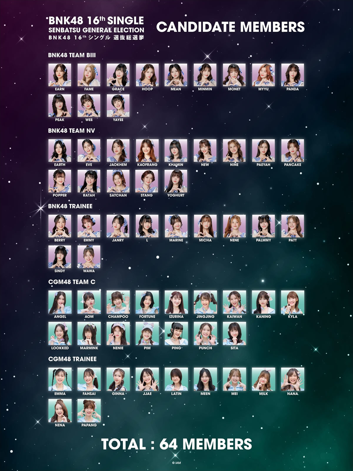 AKB48の海外グループで、バンコクのBNK48とチェンマイのCGM48のメンバーが参加する「BNK48 16thシングル選抜総選挙」の開催が決定。全64人が立候補し、ポスターも公開されました。