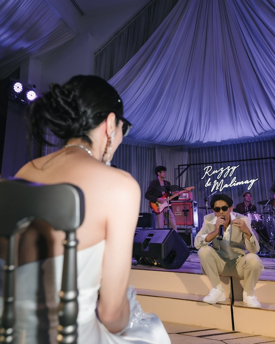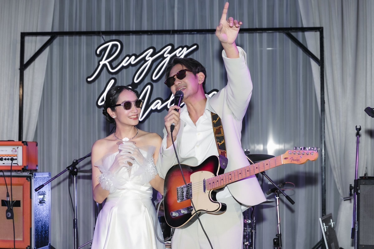 披露宴には、Tattoo Colourのメンバーら音楽業界の仲間たちが一堂に会し、ステージにも交代で登場し、愛らしい瞬間が終始続きました。この瞬間は、新郎から新婦への特別な贈り物で、ロマンチックな思い出が詰まったものでした。それは、「Love at First Sight」という曲の演奏に使用されたFenderのギターでした。