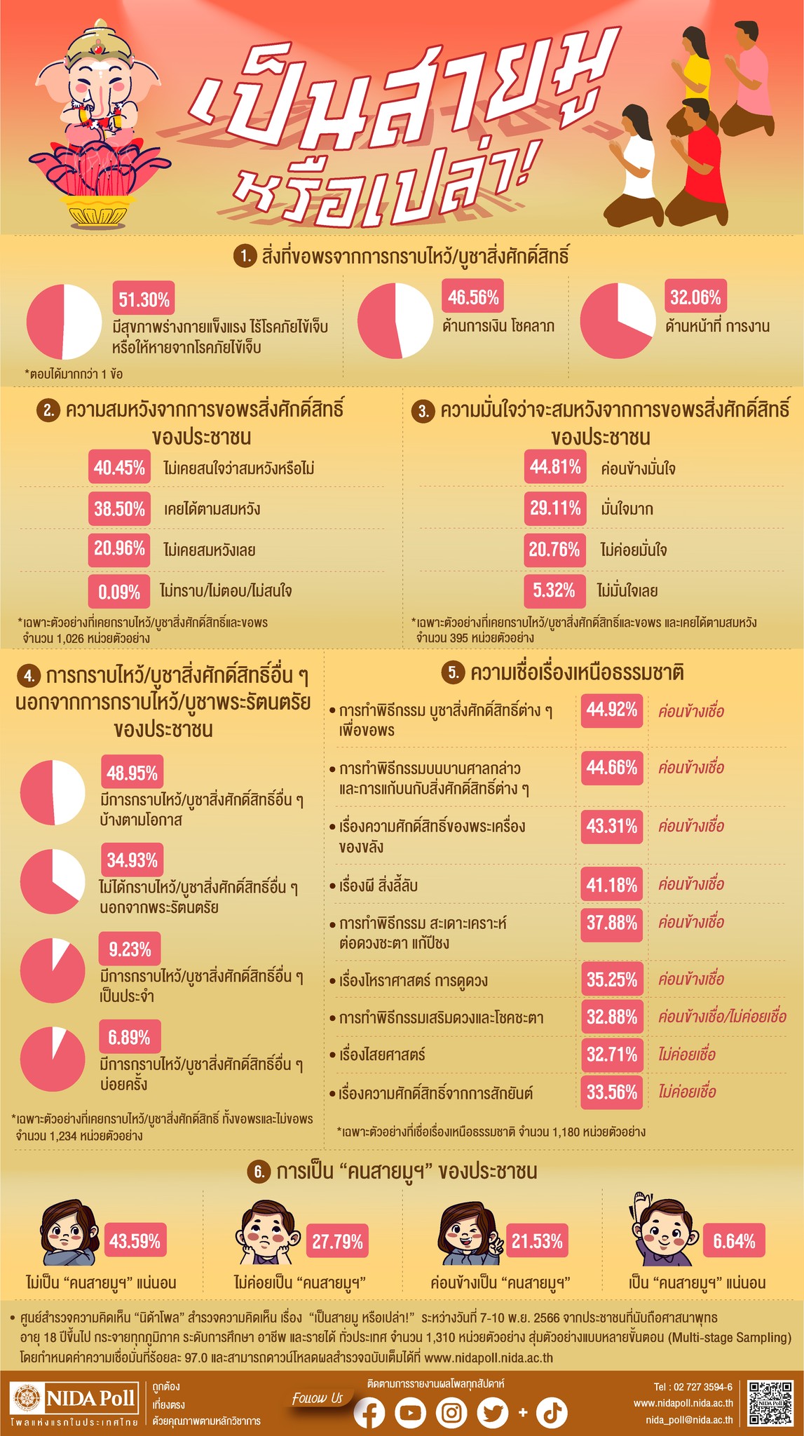 タイ国立開発行政研究院(NIDA; National Institute of Development Administration)の調査センター(NIDA Poll)は2023年11月12日、「あなたはสายมู(サーイムー)ですか?<あなたは信心深い人ですか?>」という世論調査の結果を発表しました。調査は11月7日から10日にかけて、全国の18歳以上の仏教徒1,310人を対象に実施しました。