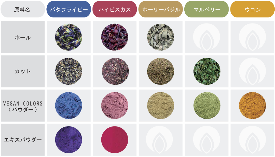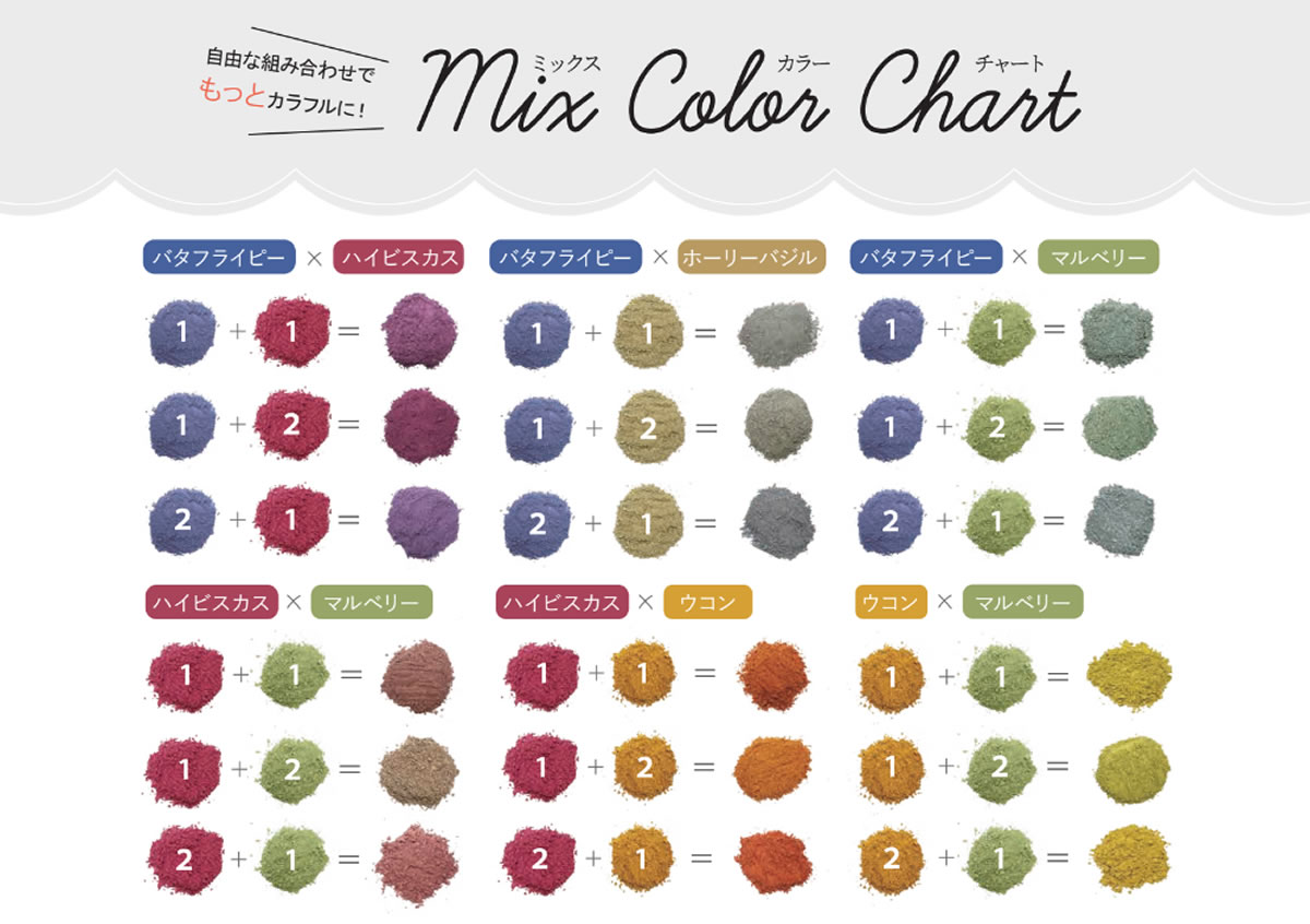 今後は、バタフライピー、ハイビスカスローゼル、ウコンの殺菌パウダーのみならず、それらを混ぜたカラフル化パウダーにも注目し、新しい市場の天然素材着色料向けパウダーの 販売を進めていきます。