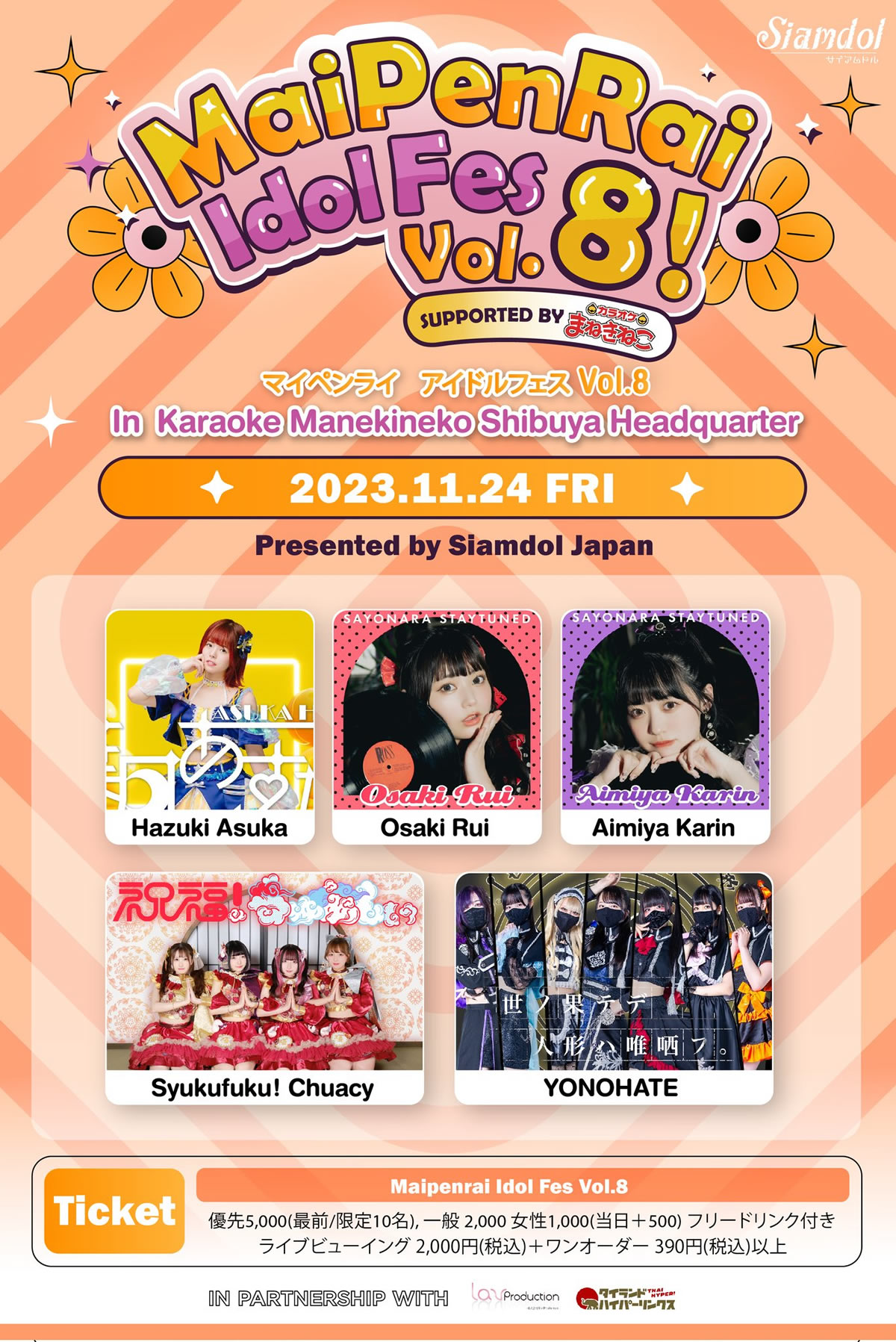 タイから日本に進出したSiamdolによるアイドルフェス「Maipenrai Idol Fes(マイペンライ アイドルフェス)Vol.8 Supported by カラオケまねきねこ」が、カラオケまねきねこ渋谷本店で、2023年11月24日(金)に開催。日本全国とタイのカラオケまねきねこでライブビューイングが実施されます。