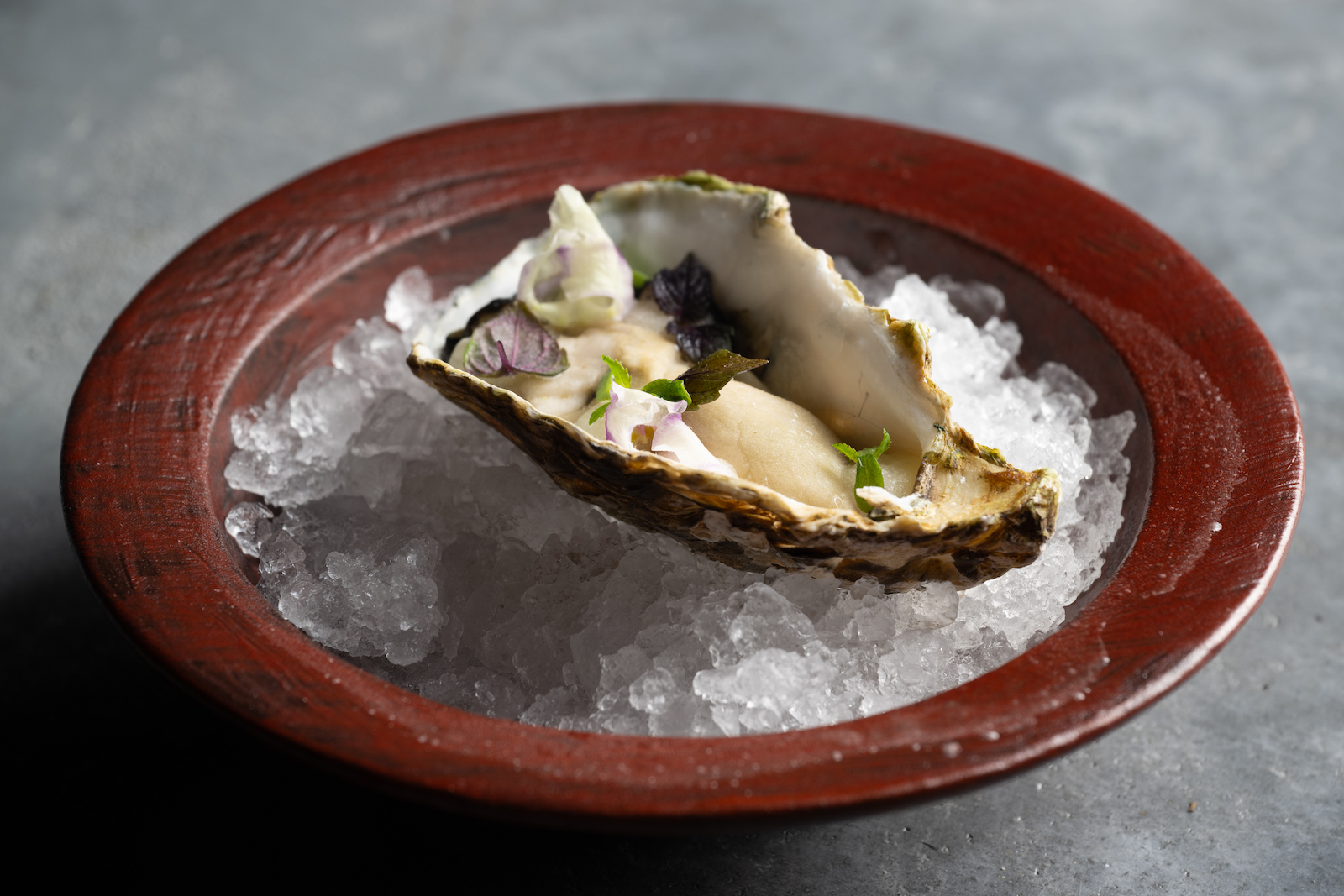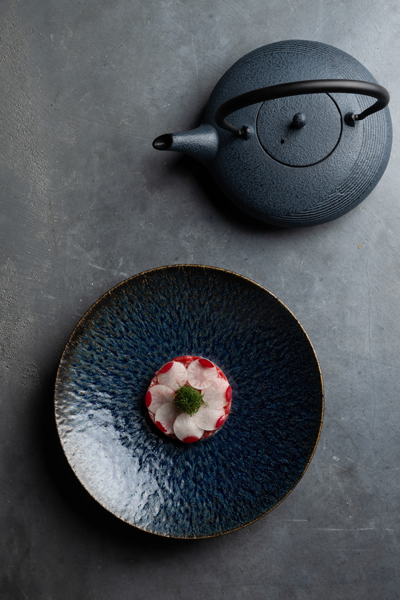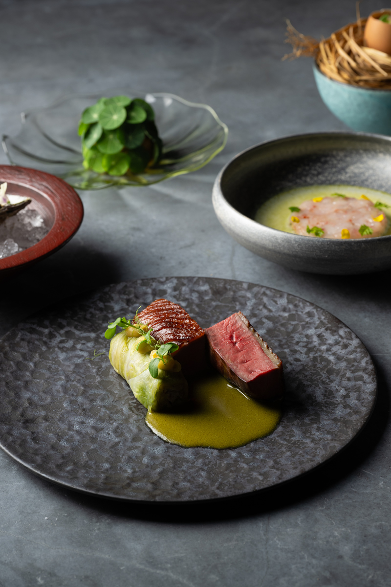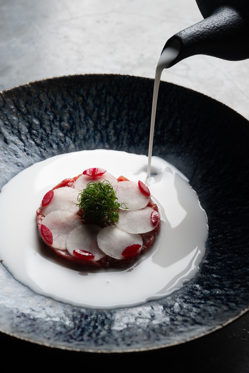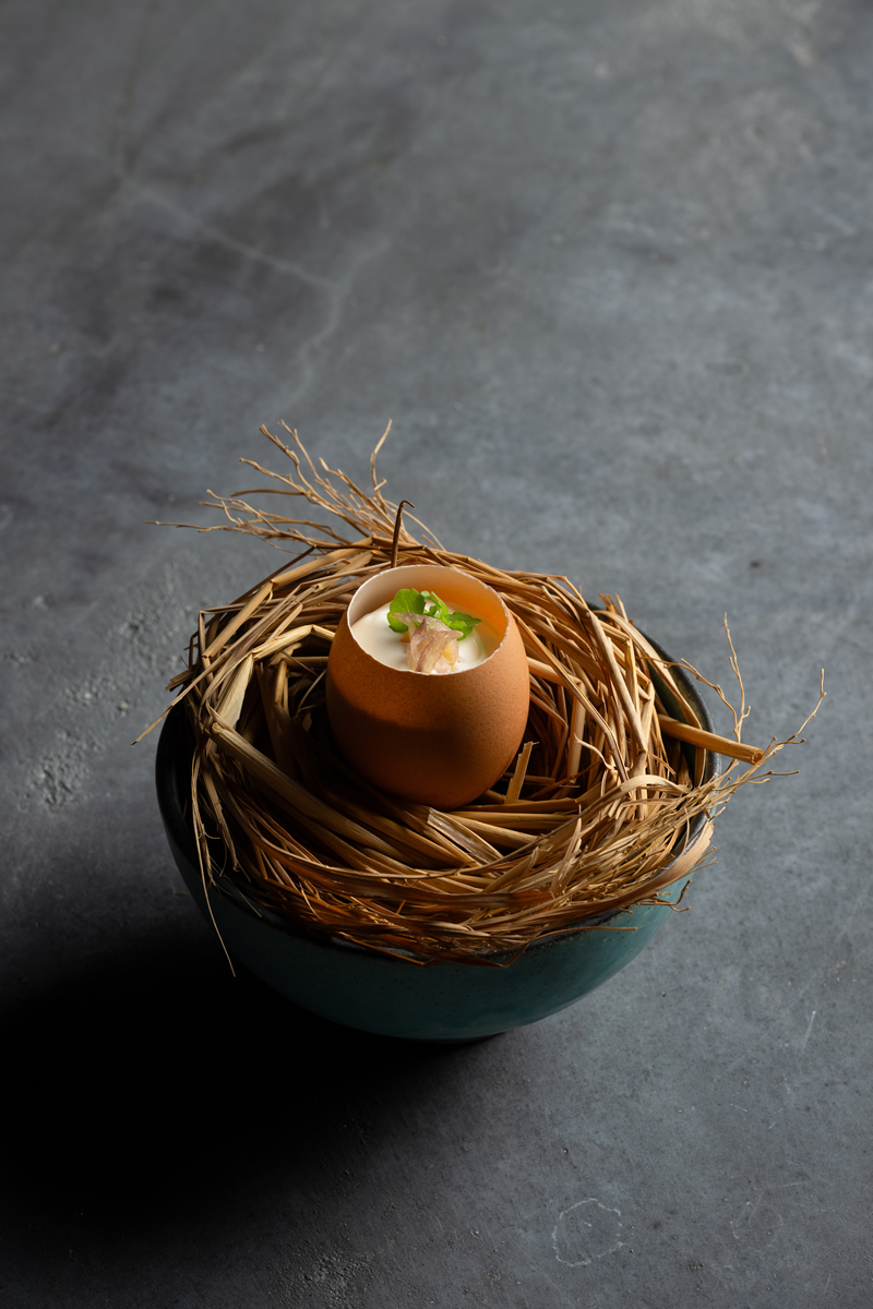 タイ南部のソールフード。シェフの祖母から受け継ぐレシピをアレンジ。ガーリックオイルにマリネした自家製の塩漬けフィレ肉に、牛骨ブロスとココナッツで3日間かけて仕込んだスープを合わせました。最後にサクサク食感の菊芋、エシャロットをトッピング。