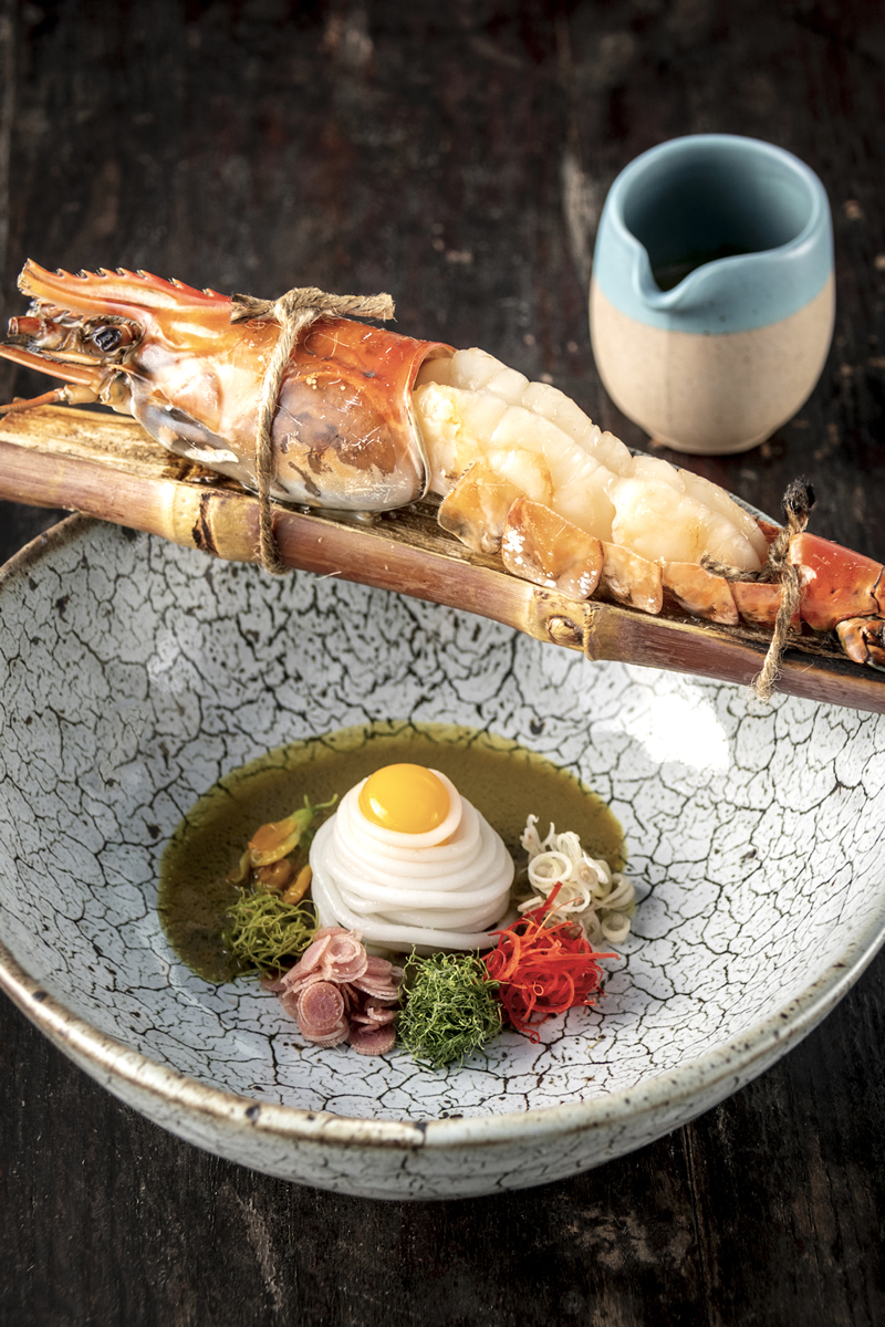 蒸した海老を豪快にのせた見た目にも華やかな一品。米粉麺と海老をレモングラス、甘長唐辛子、コブミカンの葉、ガランガル(タイ生姜)、エディブルフラワー、発酵魚介ソース、卵黄と混ぜてお召し上がりいただきます。