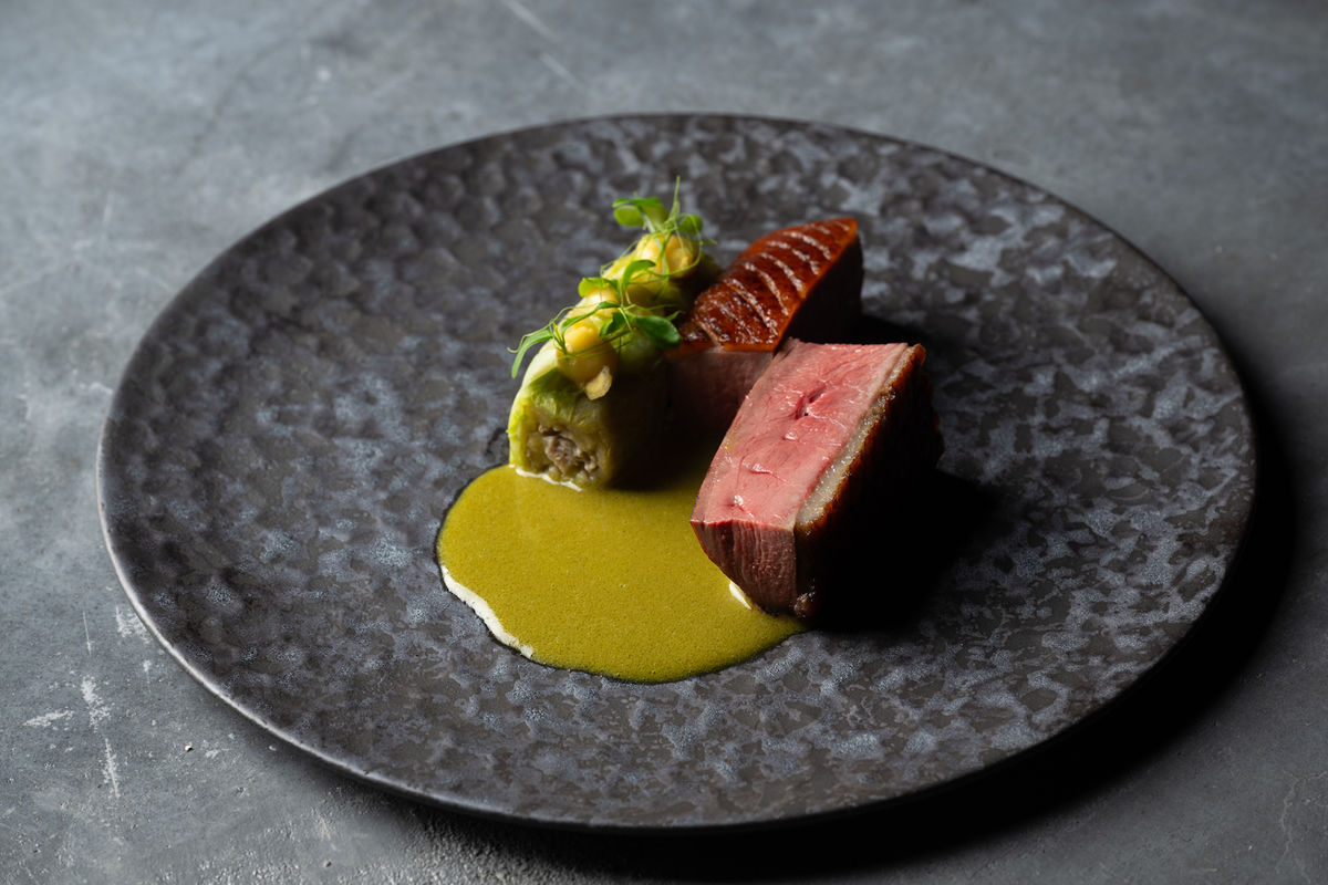 2日間かけて熟成し、中はしっとり、表面はカリっと仕上げた鴨胸肉に、素材の魅力を最大限に引き出した自家製のターメリックやハーブペーストを組み合わせたカレーソース、鴨ムースを入れたローストナスを添えました。