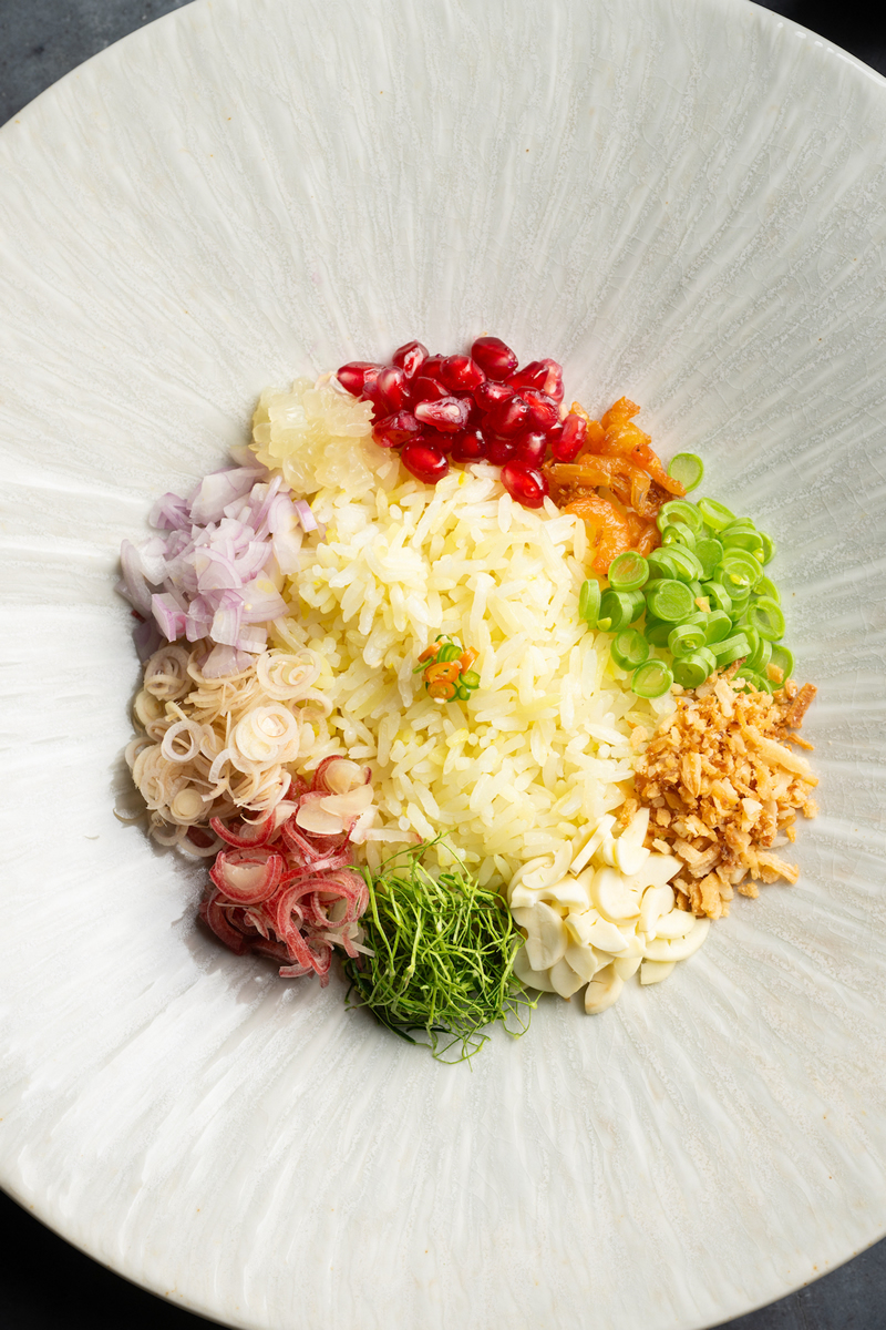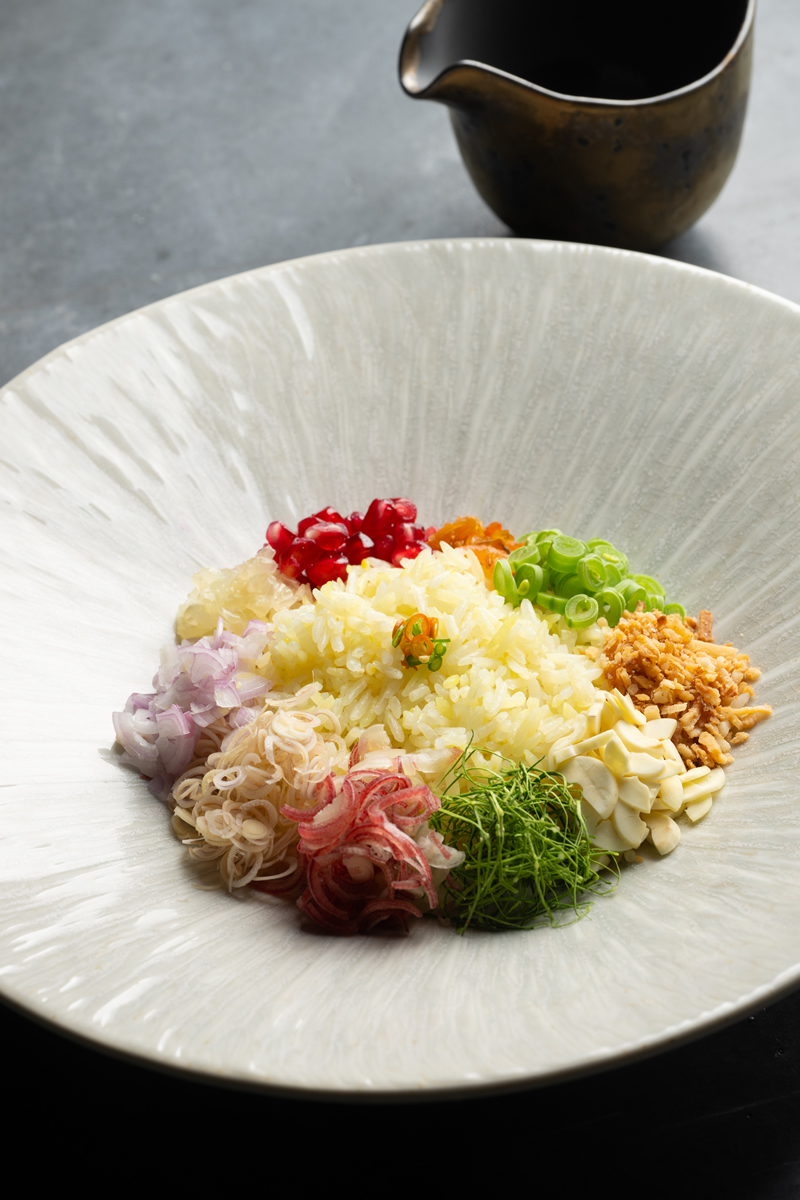 自家製のターメリックを使ったターメリックライスにレモングラス、ローストココナッツ、干し海老、鰹節、みょうが、チリ、エシャロット、ブンタン、酒盗ソースなど、12種類の食材を合わせ、それぞれの食感や味わい、五味のバランスを存分に楽しめる一品。
