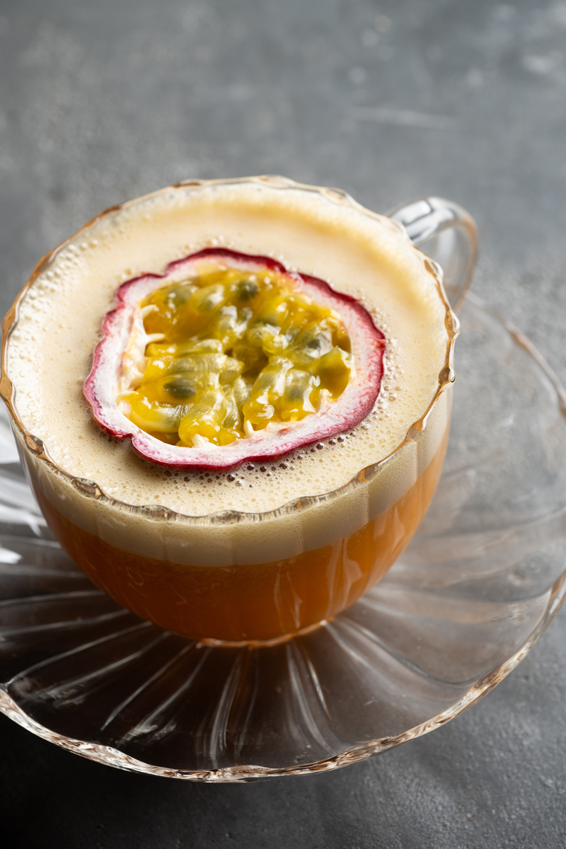 フレッシュなパッションフルーツにバニラウォッカとアーティチョークをミックスした大人なカクテル。最後にハーフカットのパッションフルーツをトッピング。