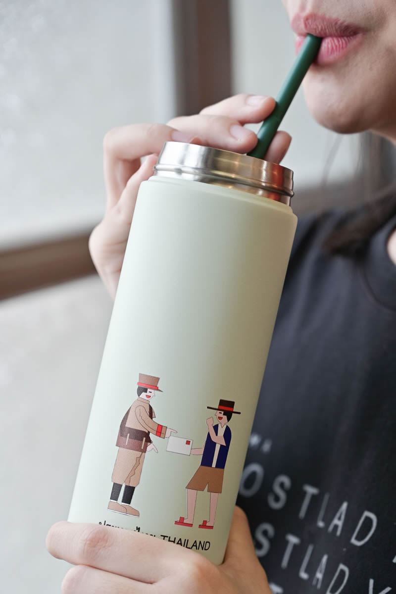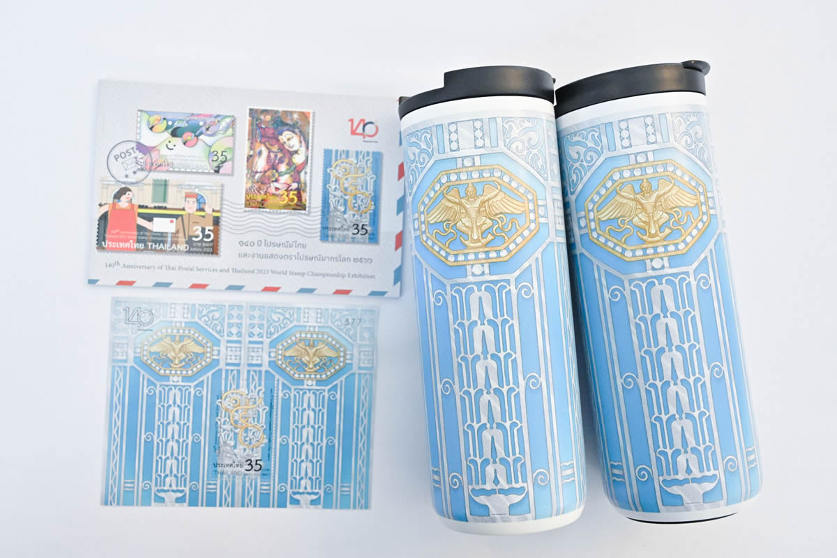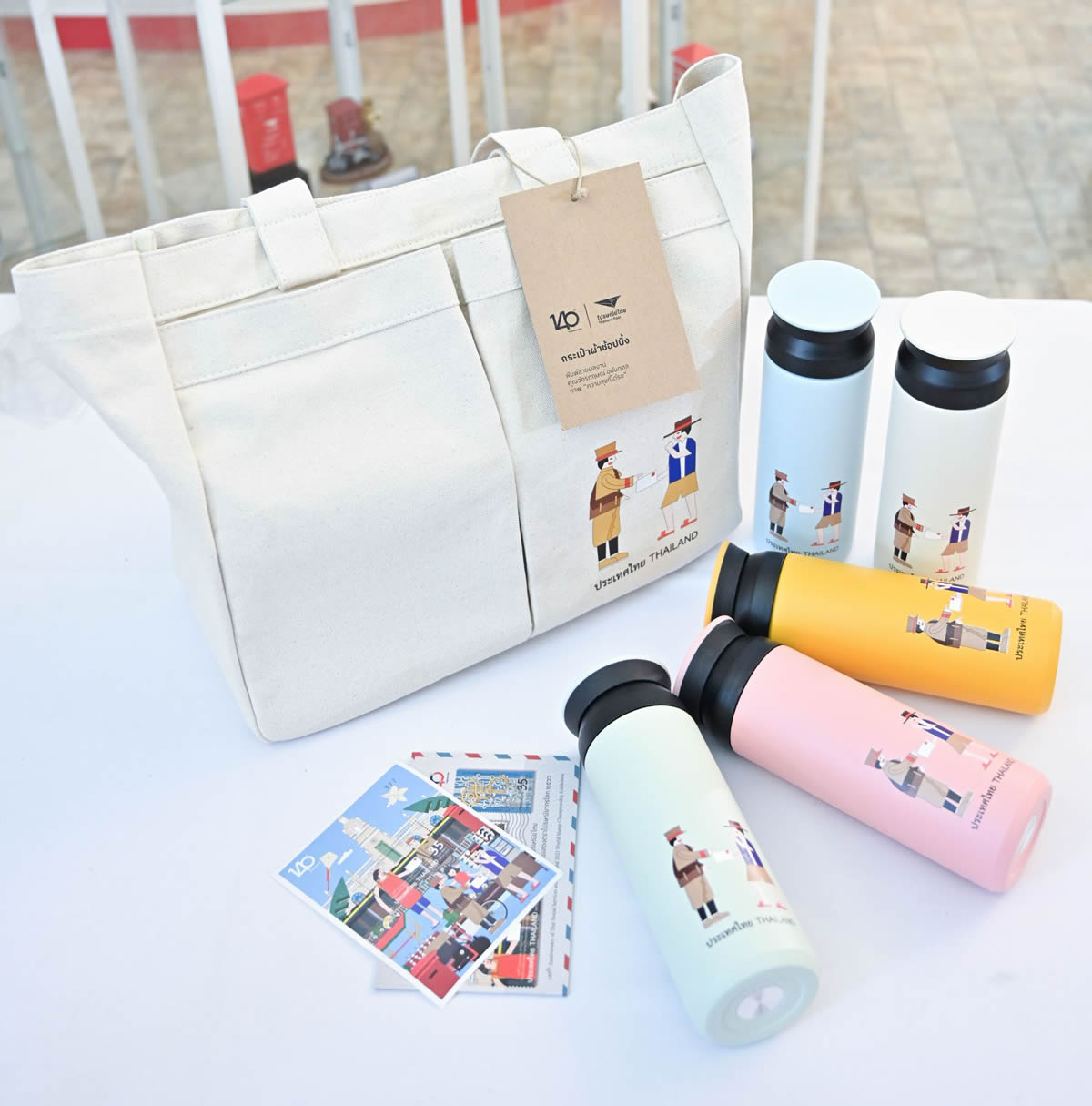 4種類の「タイランドポスト140周年記念切手」デザインの中でも特に目を引いたのが、ヌア=ジャックリット アナンタクン(เหนือ-จักรกฤษณ์ อนันตกุล)さんが描いた郵便配達人。切手の他にもバッグとタンブラーがあります。