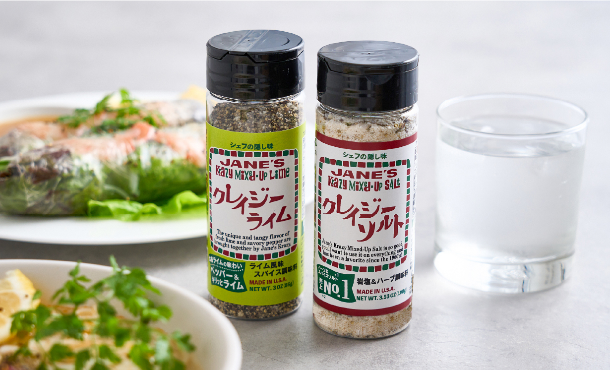 『クレイジーソルト』は、1960年代のアメリカに住むジェーンおばさんのキッチンで誕生しました。ひと振りで簡単においしい料理が出来るシーズニングが欲しいと考えたジェーンおばさんは、別々に使っていた岩塩やハーブを一緒のボトルに入れることを思いつきました。こうして、ジェーンおばさんが一番おいしいと思う割合で素材をブレンドした調味料、『クレイジーソルト』が誕生しました。